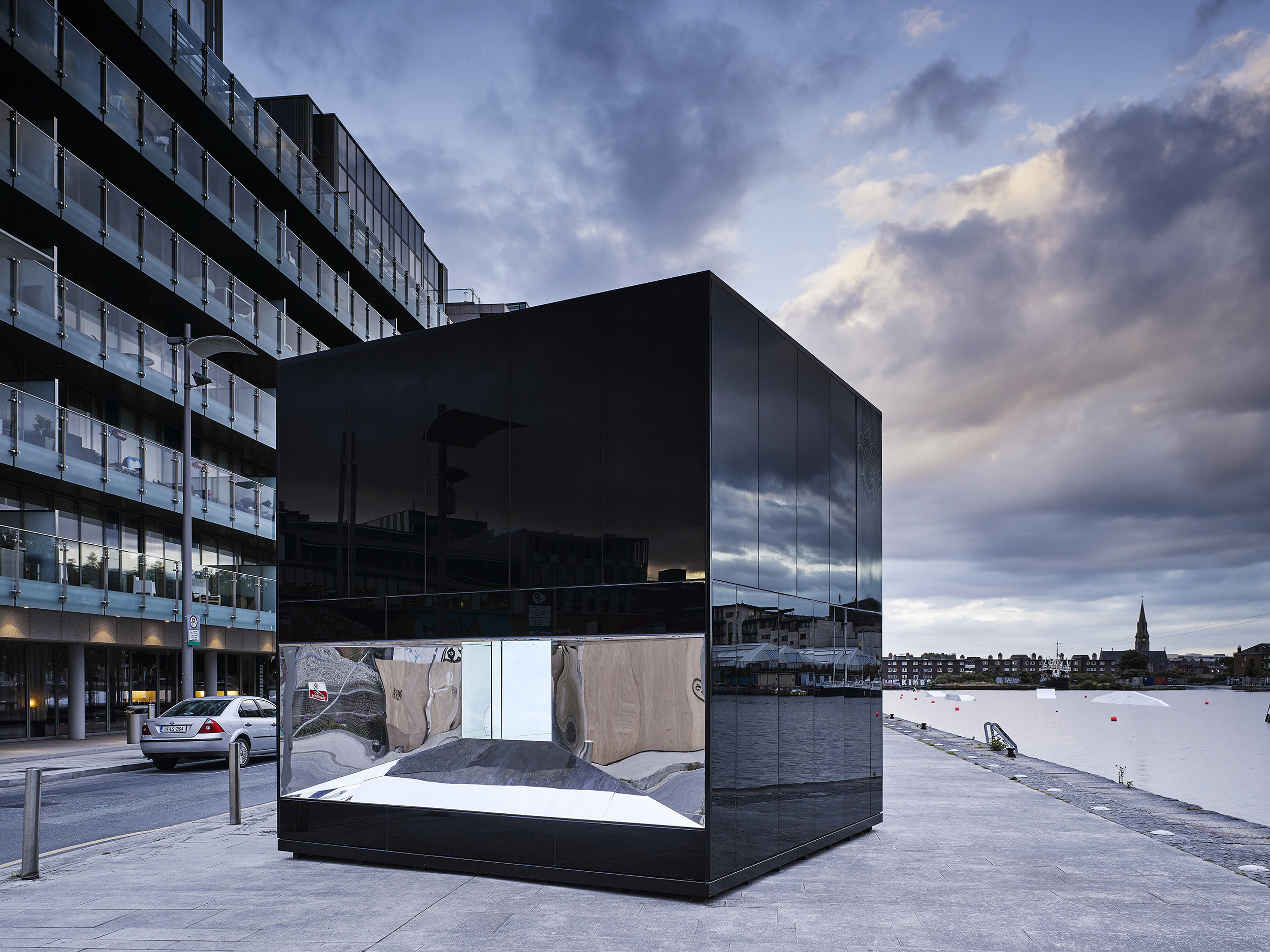 5CUBE is a semi-permanent pavilion in Hanover Quay, Dublin Docklands, physically representing the volume of oil consumed every five minutes in Ireland. It was designed by Declan Scullion of de Siún Scullion Architects.
