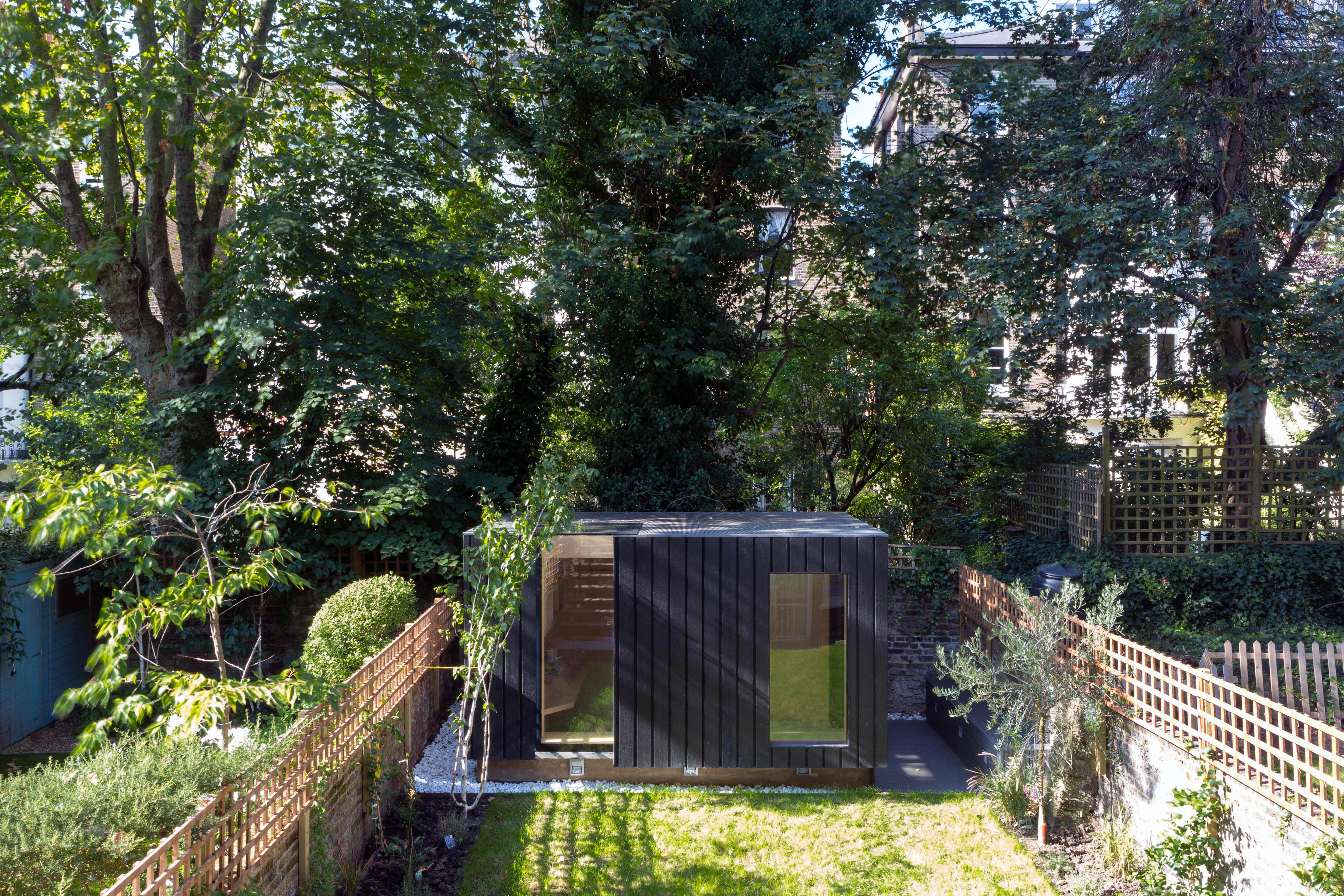 The project, situated in a back garden of a Victorian house in a Conservation Area, is surrounded by lush and verdant vegetation with large trees.