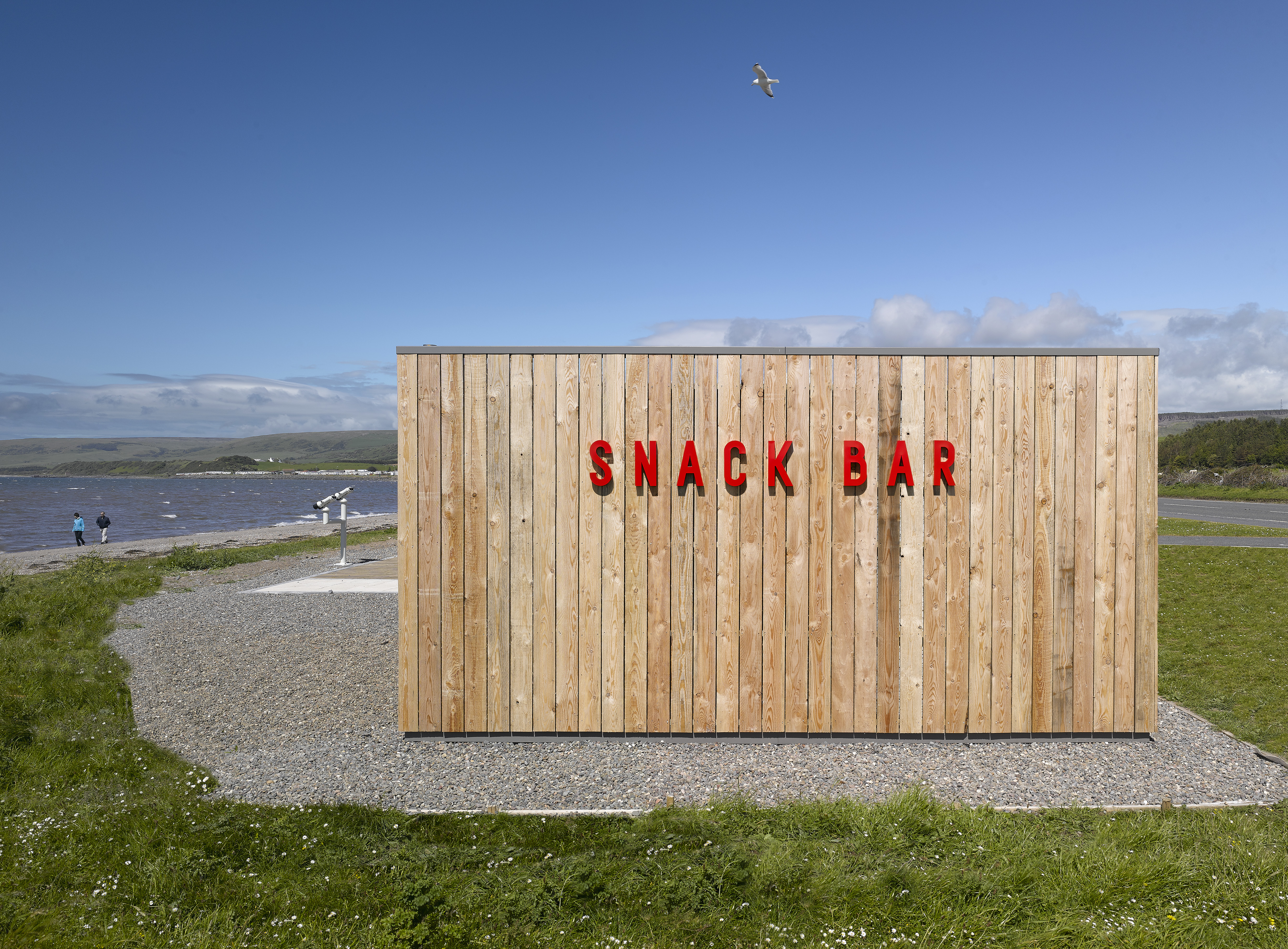 The first completed ‘Gateway’ is at the Balyett layby adjacent to the A77 with extensive views down Loch Ryan and incorporating a popular but tired-looking café. The project entailed construction of a cantilevered larch-clad pavilion providing sheltered seating and a binocular outlook to take advantage of the panoramic views and shoreline birdlife. The café was refurbished externally to compliment the rural shelter creating a simple, functional place sympathetic to its surroundings. It serves visitors and the local community alike and makes reference to the porthole views of the visible but distant ferries.