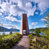 The viewpoint takes the shape of a triangular platform and is positioned at the end of a long curved path stretching form the car park to the highest point of the peninsula.