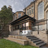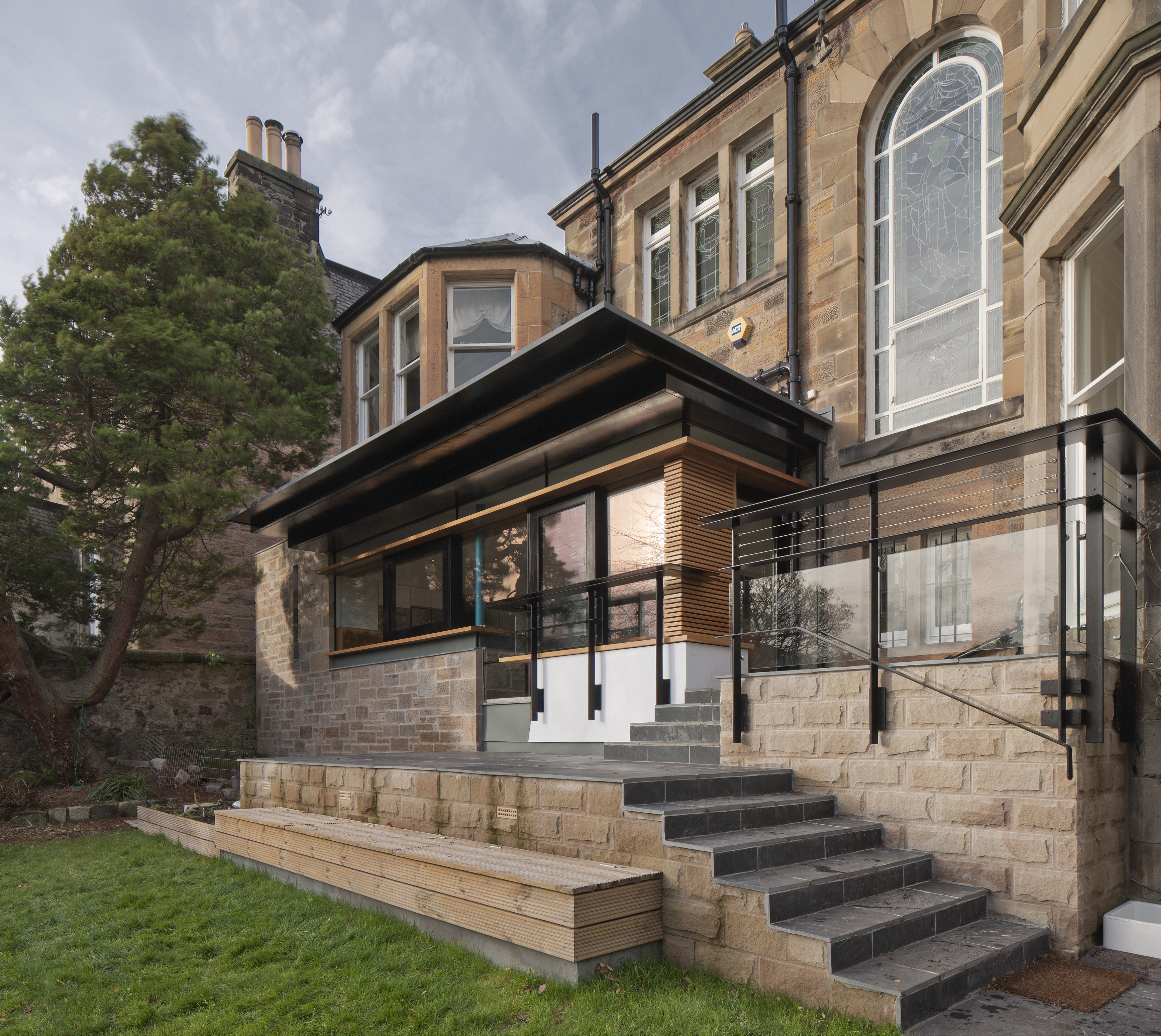 Complex and largely concealed steelwork holds up the heavy stone upper storey, with a thin-edged cantilever roof providing sheltering and deeply shadowed eaves.