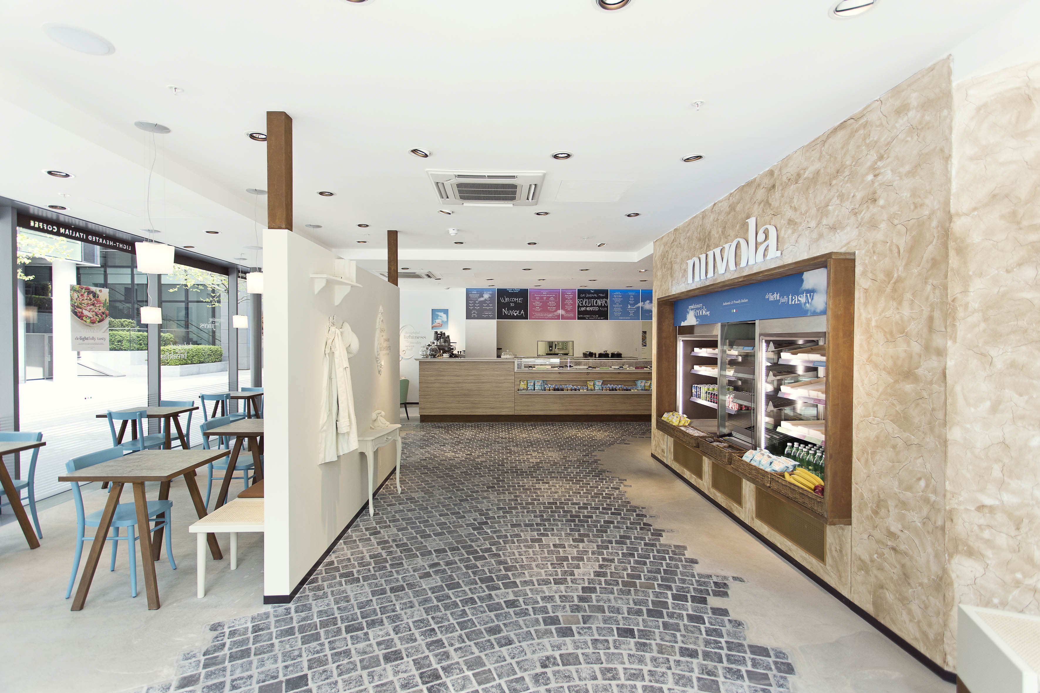 The Nuvola interiors utilise a natural and seasonal colour palette derived from the brand dedication to use seasonal Italian ingredients for its menus.