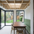 A key principle of the design intent was to clearly define the kitchen area from the dining space and we wanted to achieve this through materiality. We used exposed timber in the dining area roof in a net formation and proportioned a rooflight and interior lighting to the grid. In the kitchen brick-slips were used as a backdrop to dark timber kitchen units. The light coloured flooring allows these materials to come to the fore whilst leading your eye through the kitchen to the garden.