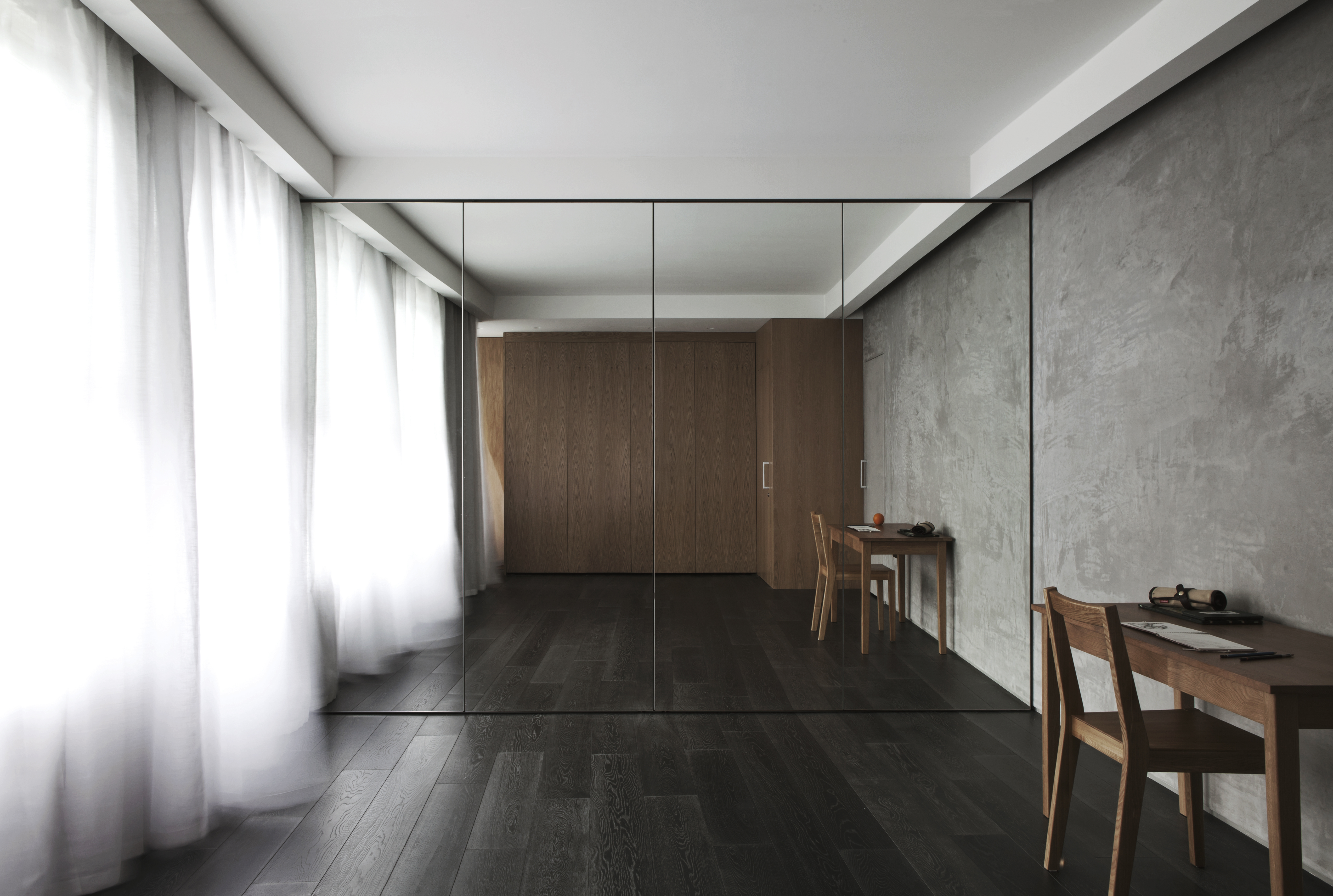 Despite its size, the apartment feels open and spacious due to the use of mirrors and two cleverly designed storage units at either side of the room. The first unit opens to reveal a full kitchen and the entrance to a wet room, while a bed folds down from the opposing unit which also houses a wardrobe and storage space. Net curtains diffuse natural light and act as the only soft material in the room, juxtaposing the bare, harsh textures elsewhere.