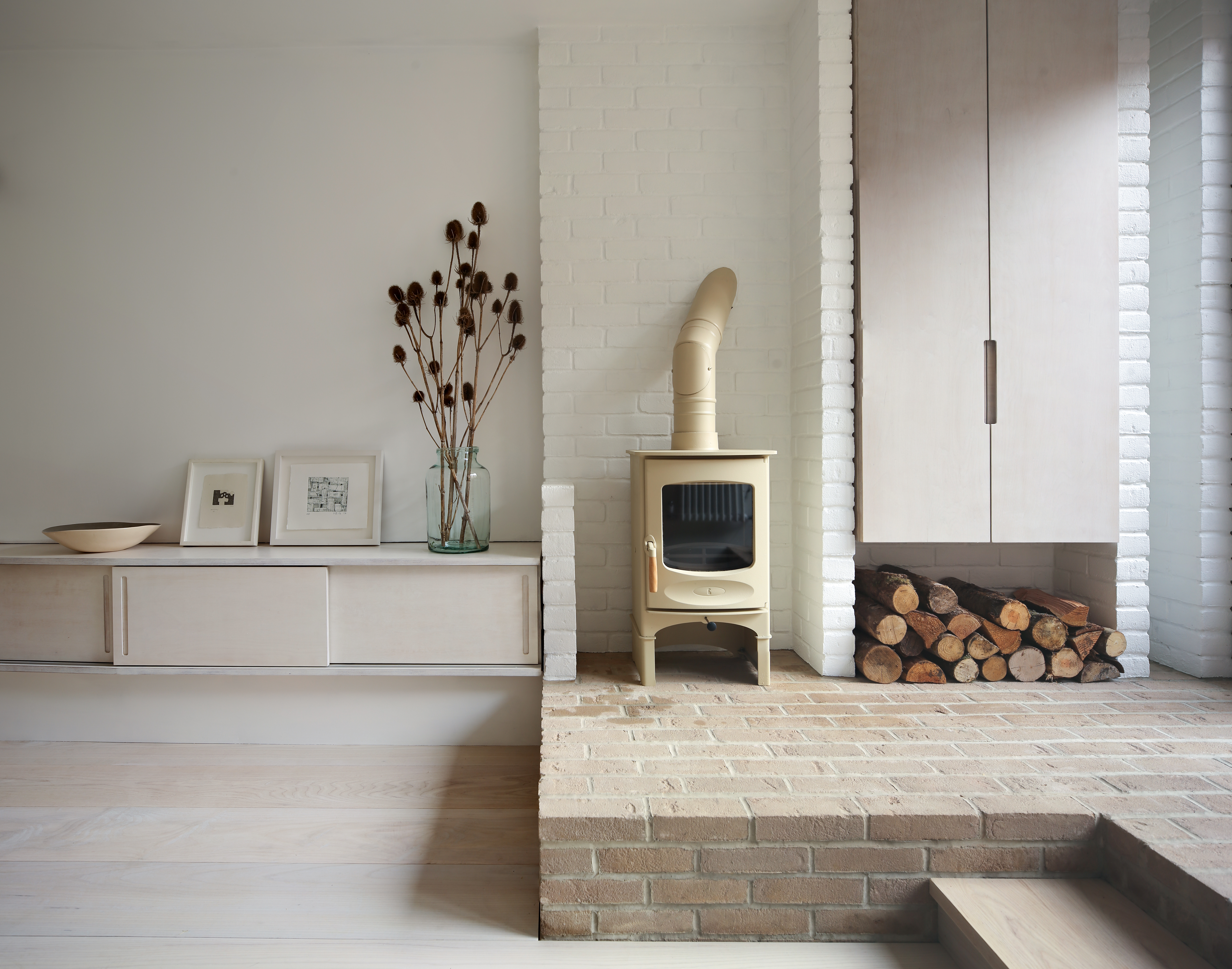 The whole site is treated as a cascade of terraces that rise through the house and out into the garden. The ground levels have been reduced at the rear and a series of brick-paved steps and patios constructed to make a more gradual transition from the house to the garden. Full-width folding-sliding doors allow the living area to open up to an enlarged patio and the brick pavers flow inside, blurring the threshold to the outside. Rather than emphasising a distinction between old and new elements, the interior is treated as a collage of materials and textures, bespoke joinery and lighting to create an atmospheric sequence of light and flowing spaces. Suspended brass light fittings have been designed specifically for the brick vaulted dining room.