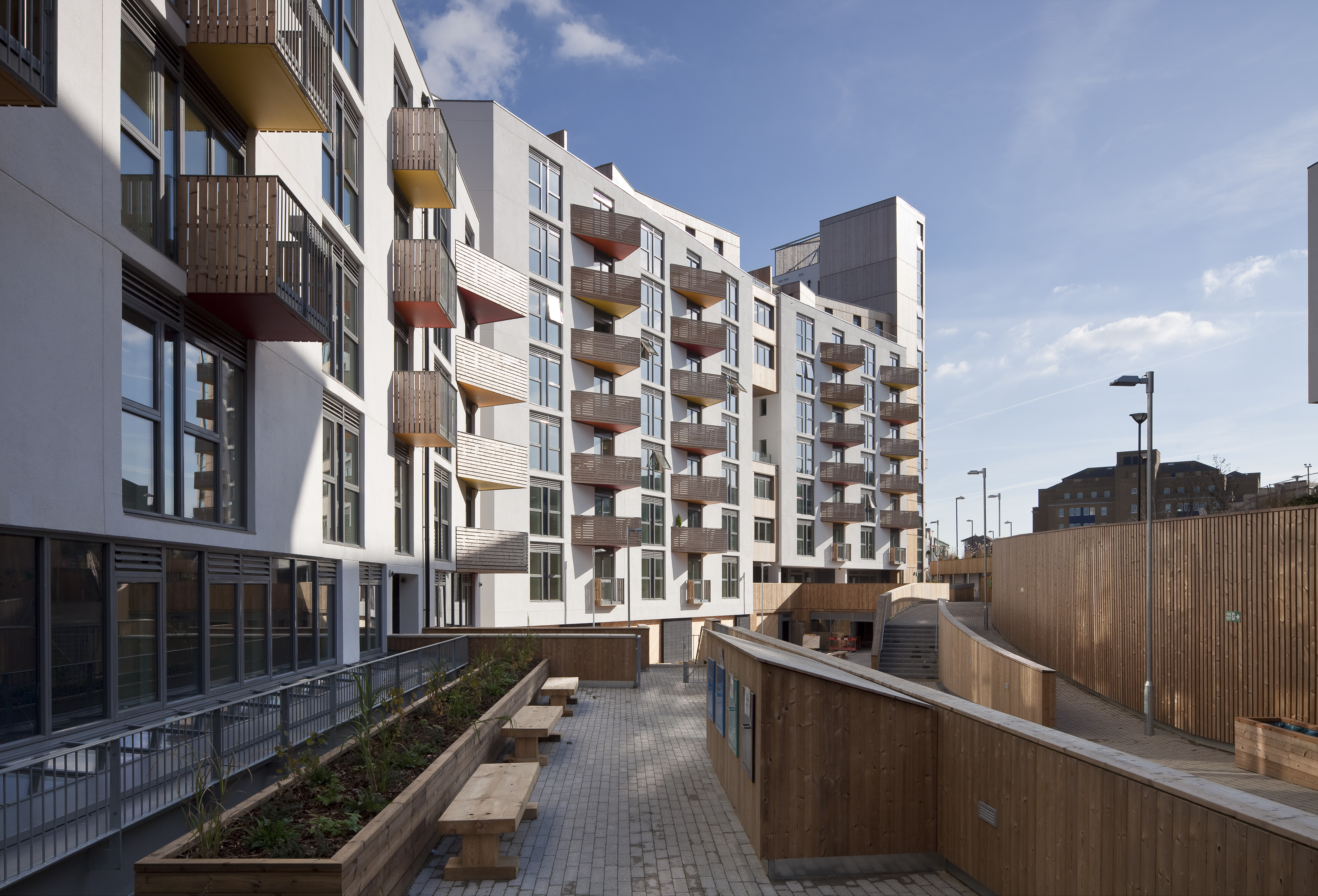 The apartments share facilities of an on-site car club, community centre and office space, and a cafe. Residents can grow their own food in 'sky gardens' on the roof and the building has its own green lifestyles officer to support residents. This scheme has 31 per cent affordable housing.