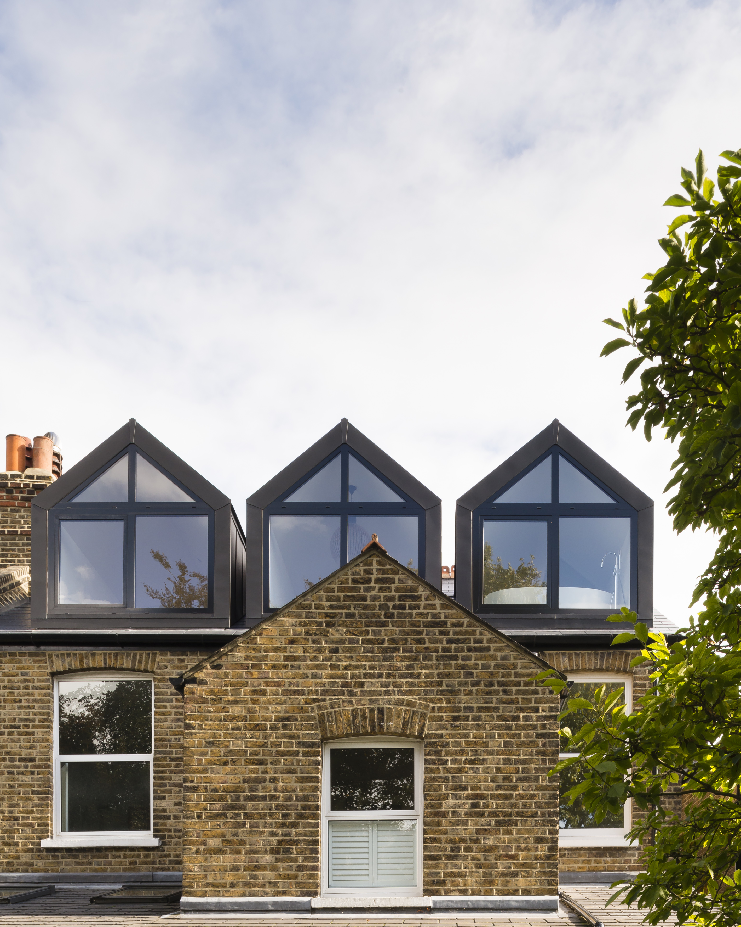 The original house is a four-bedroom family home in Dulwich with an ornate period front, and a rear elevation with an apex-shaped closet extension. The aim was to re-create the apex geometry by making three careful incisions into the roof and inserting simple, modern dormers that would accentuate the Victorian geometry but in entirely different materials and using modern technology.