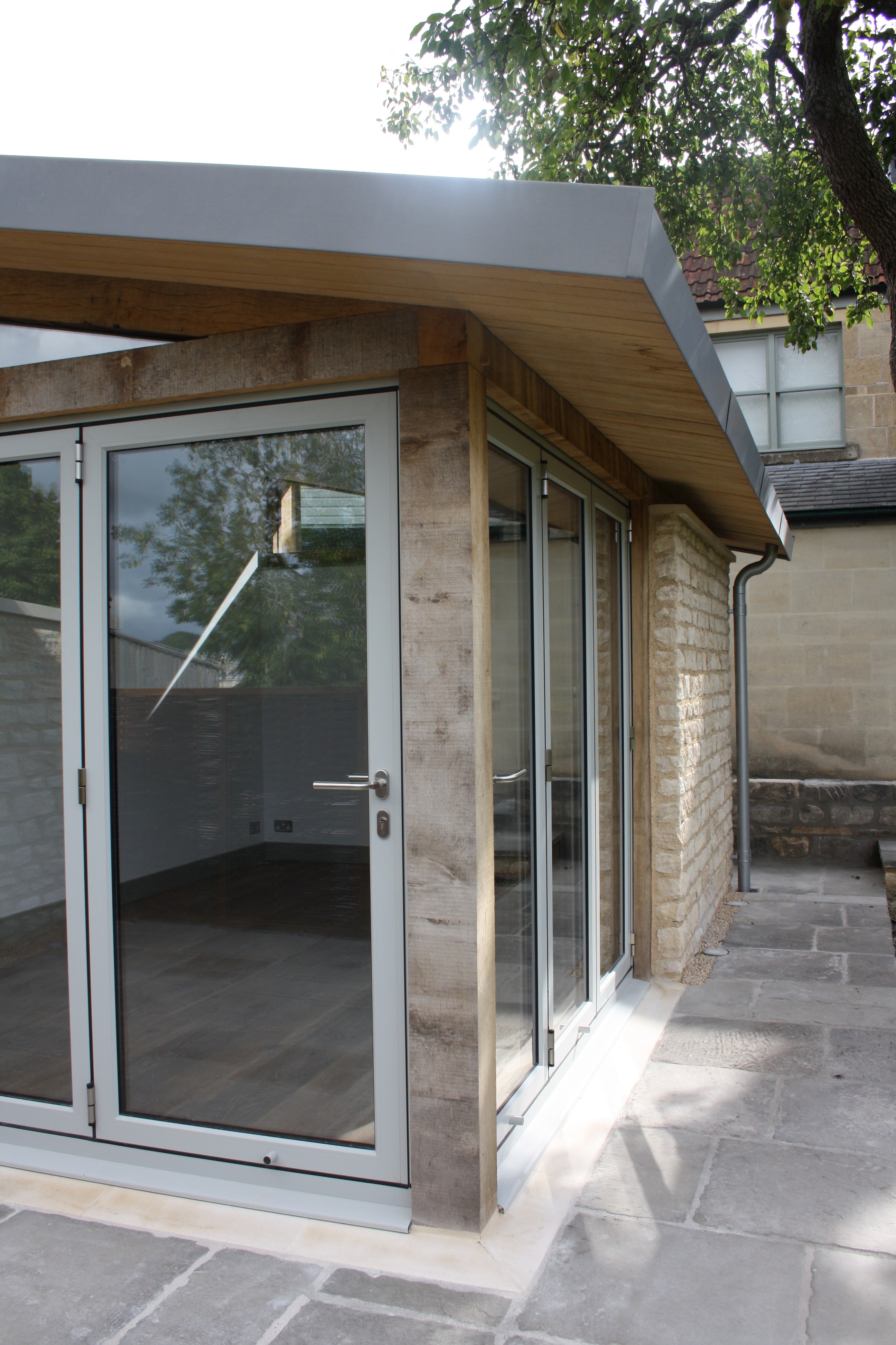 The new building was constructed of oak frame with infill timber frame panels clad with natural rubble Bathstone to the garden aspect, and render to the hidden rear elevation. Large sliding folding doors to the south west corner open the internal space up to the garden.