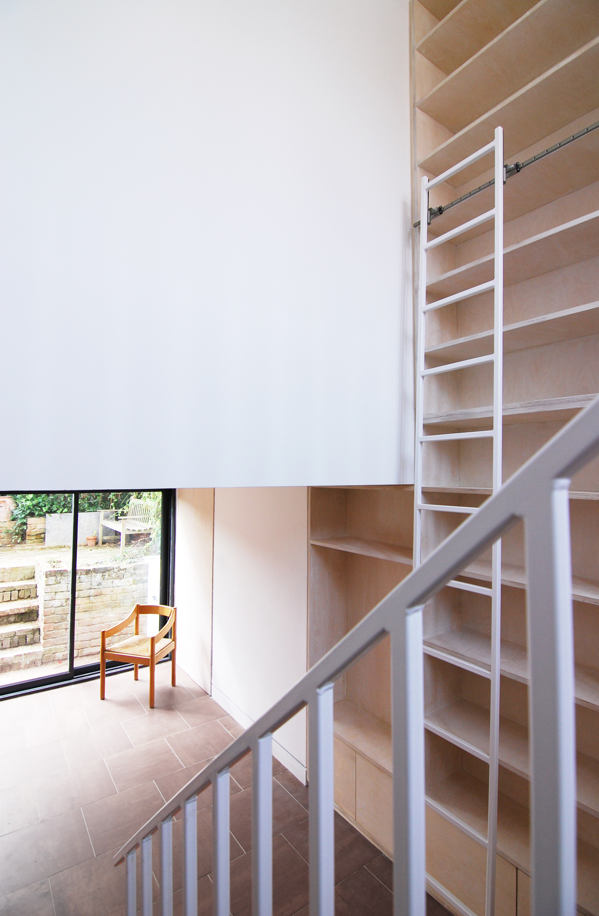 The joinery elements are made from birch plywood and finished with a semi-transparent white wax, the balustrade, bannister and sliding library ladder from bespoke white powdercoated 20mm square-section steel. A new terracotta floor picks up on the tones of the external red brick paving and completes the palette of soft, earthy materials.