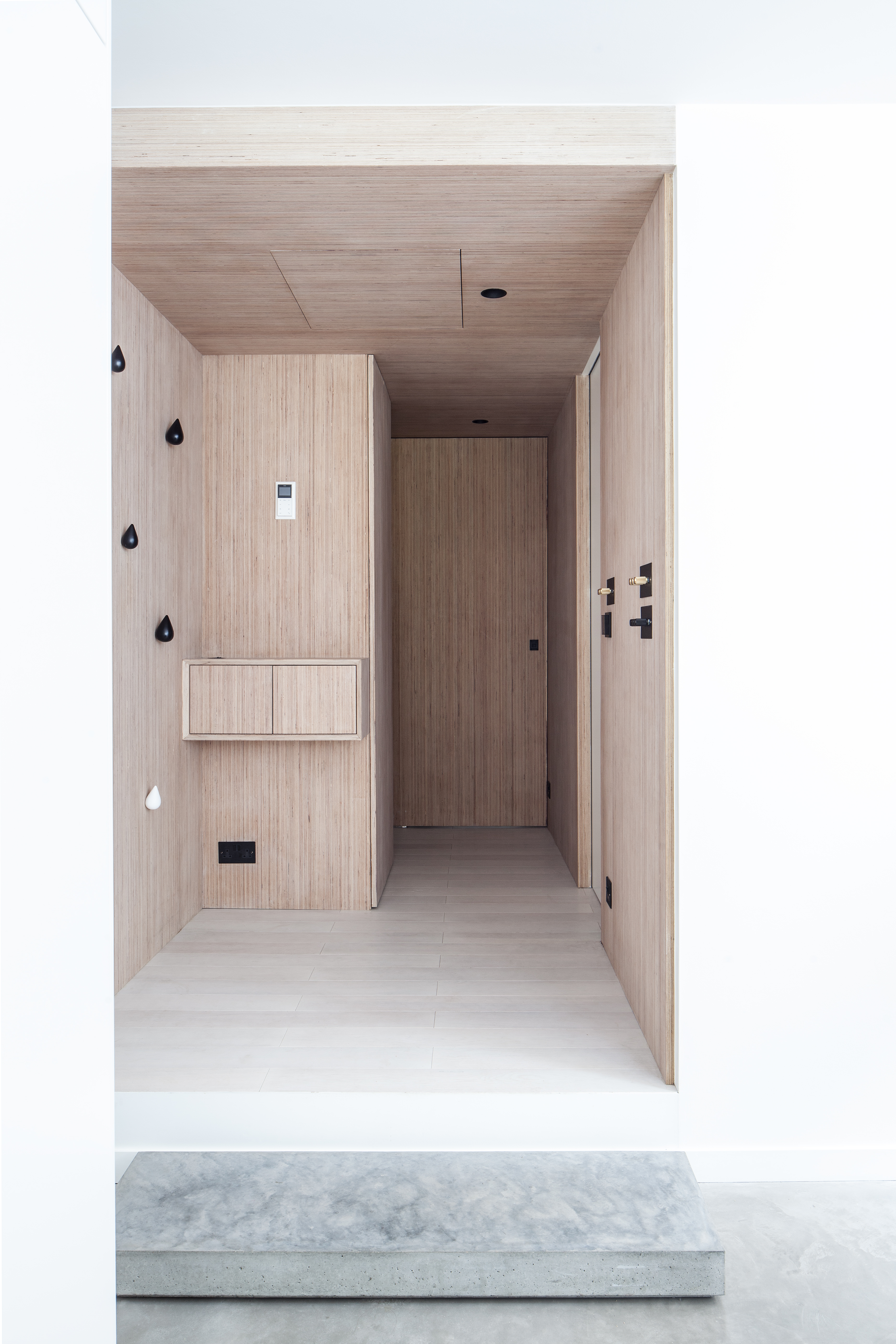 From the comfort of the sofa, the striations of the laminated timber panels direct the eye up towards a small roof light that catches the golden hue of the late afternoon sun. These same beech panels are further employed to articulate the various activity spaces throughout the flat – the reading ‘nook’; the utility shelf; the concealed fire door; the cubbyholes. At the heart of the family room is the undulating bespoke Kitchen island unit. Constructed of oak veneered boards and floating on a sea of concrete this piece of landscaped furniture was designed to encourage the interaction of everyday family life.
