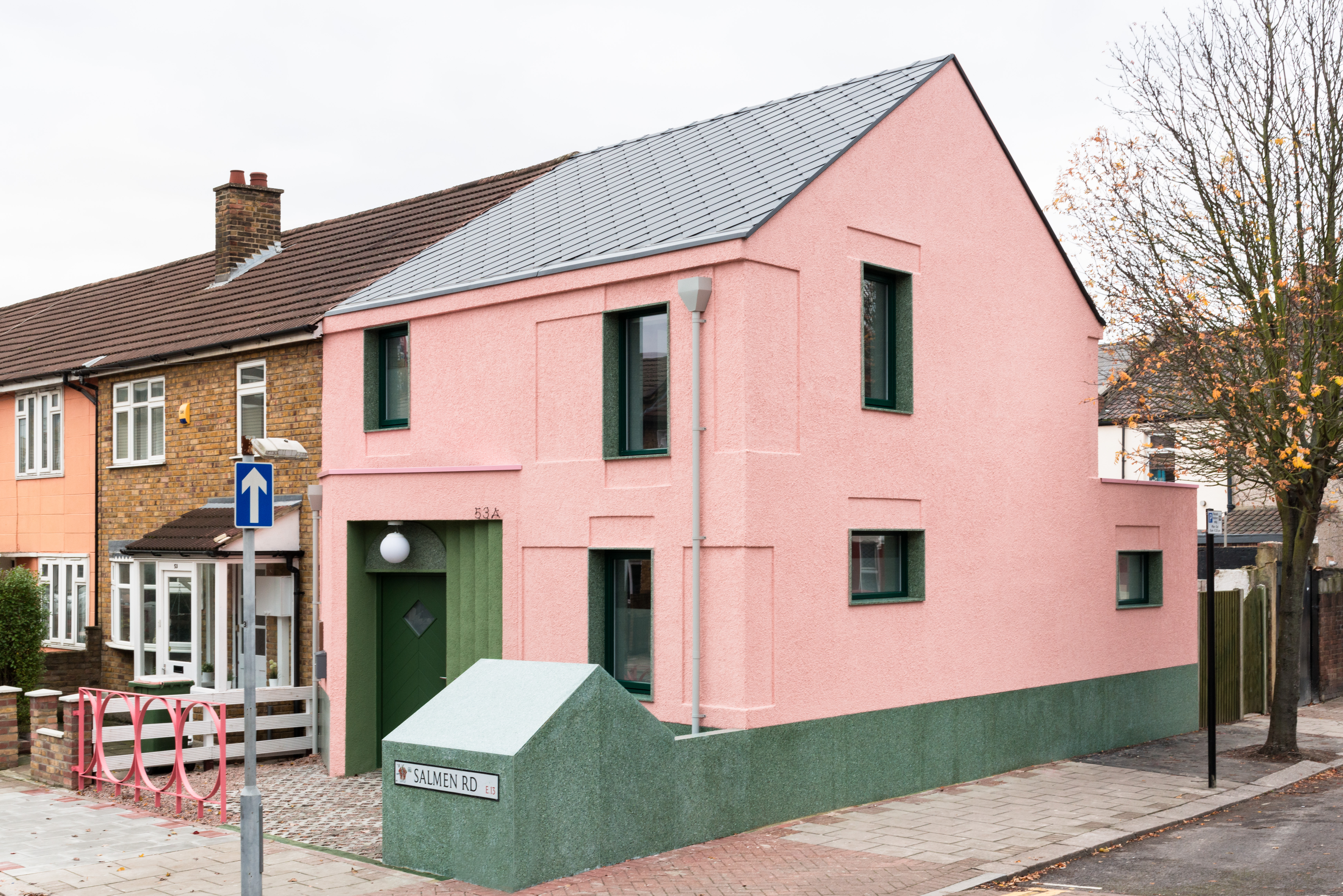 The house is generous to the street, rather than being overly polite to its mish-mash context of late Victorian, mid-century, and post big-bang housing. The millennial pink exterior breaks away from the traditional design and biscuit-colour of rented accommodation. The complimentary external colours, salmon pink and lush green, visually push apart to create a feeling of greater volume - the pink moving forwards and the green stepping back. The stippled render and textured terrazzo have a material richness to them, catching changing shadows on the long flank wall throughout the afternoon. Surrounding the windows, polished terrazzo reveals bounce additional light inside, as well as mirroring the window details found along the mid-century terrace.