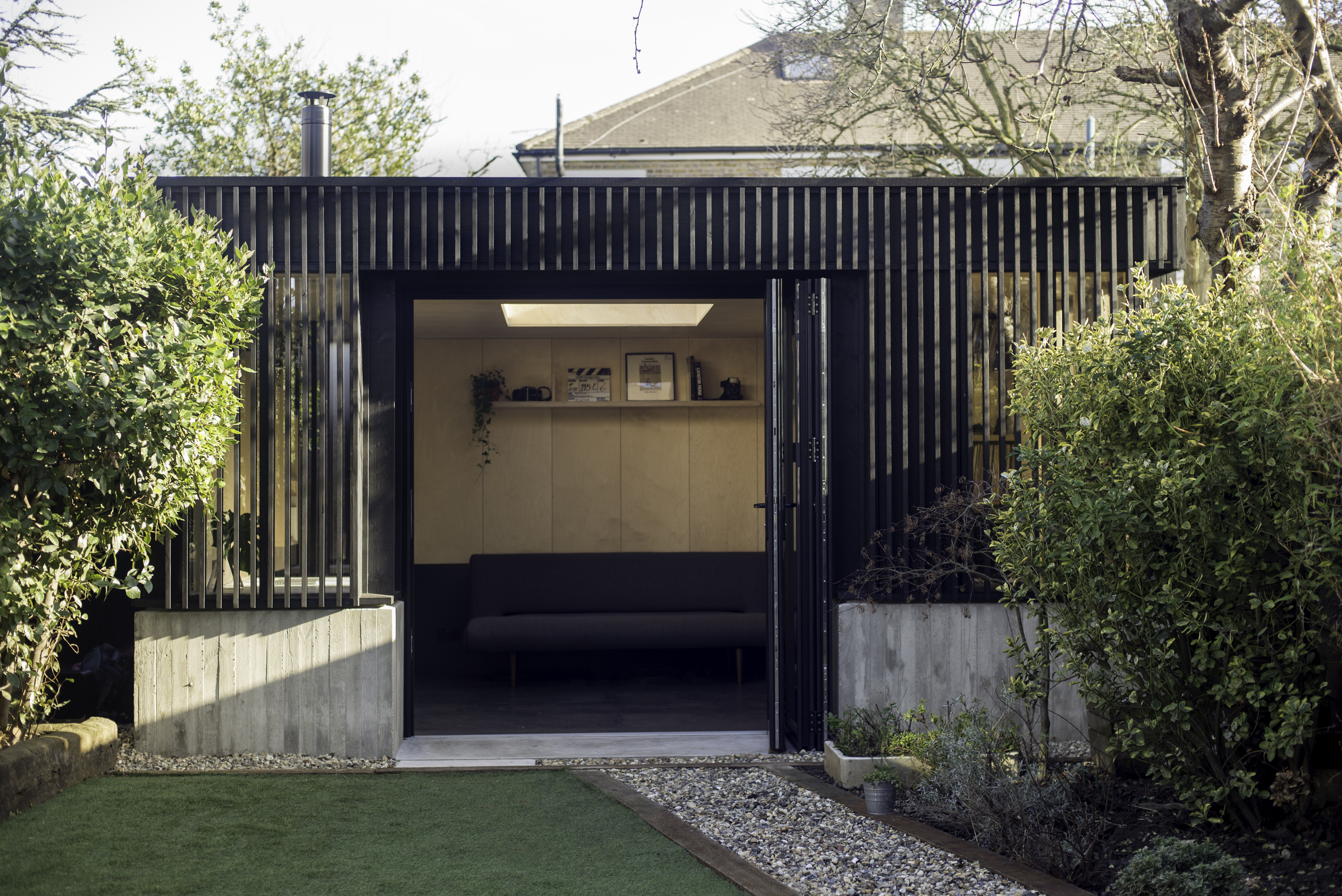 A large kitchen window offers a singular view down the garden, towards a new lightweight pavilion, which borrows heavily from the Sukiya-zukuri (referring to the clients much loved Japanese tea house) aesthetic. It is essentially a concrete box with a blackened timber lid and functions as a working studio for a cinematographer. As such it is loaded with visual references; placed under a mature cherry tree and to receive the warm afternoon light, the intention is to create a valuable and much needed work space which feels at once contemplative yet lambent.