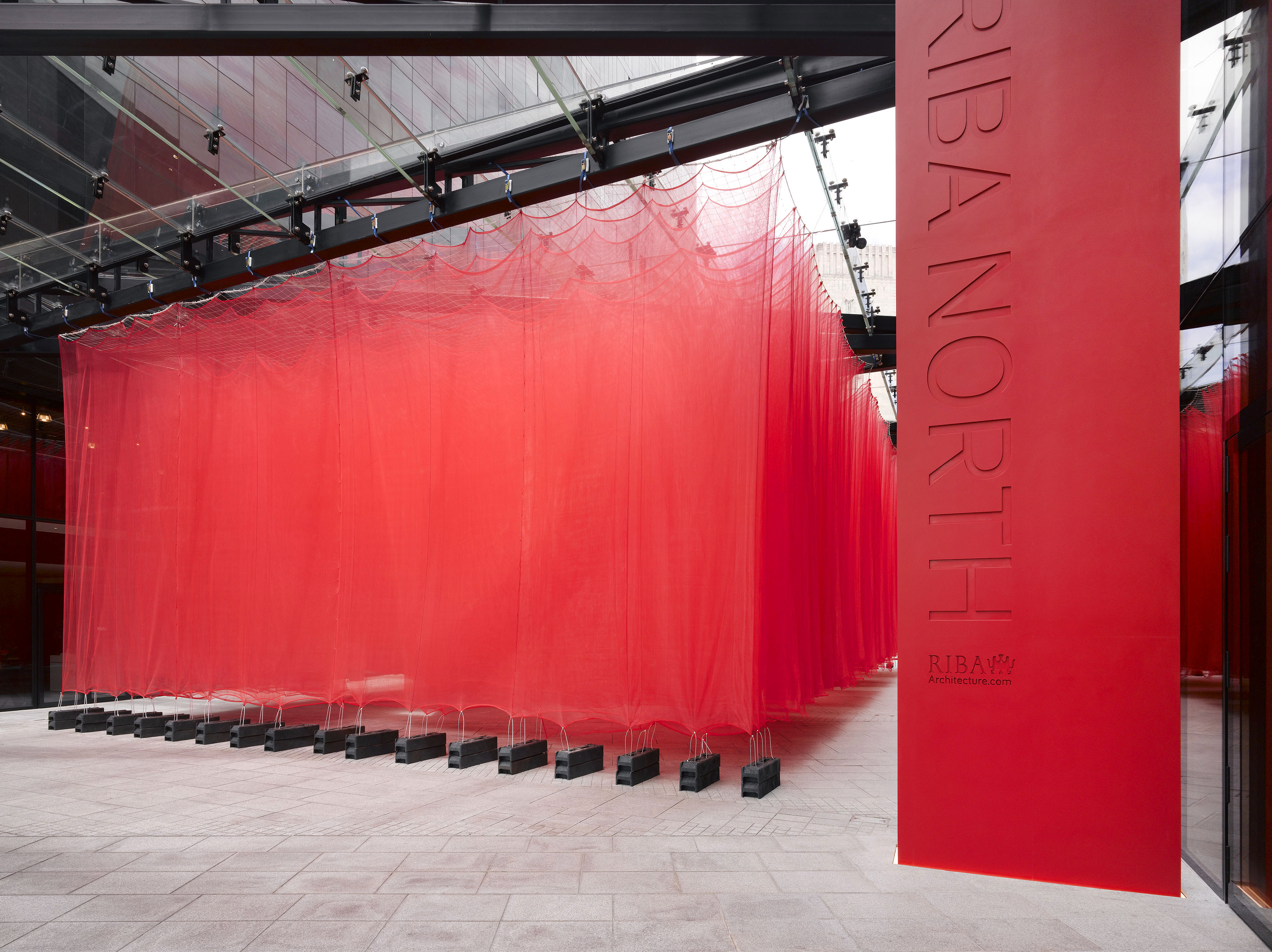 The installation drew on these integral elements of architecture, symbolised by a typical building site material that is used to create iconic structures. These structures became an immersive and accessible space within the entrance atrium of the Mann Island Building. The material used was a typical red mesh that usually covers building site scaffolding to protect the Architecture. The material also created a desired reference to the RIBA branding red.