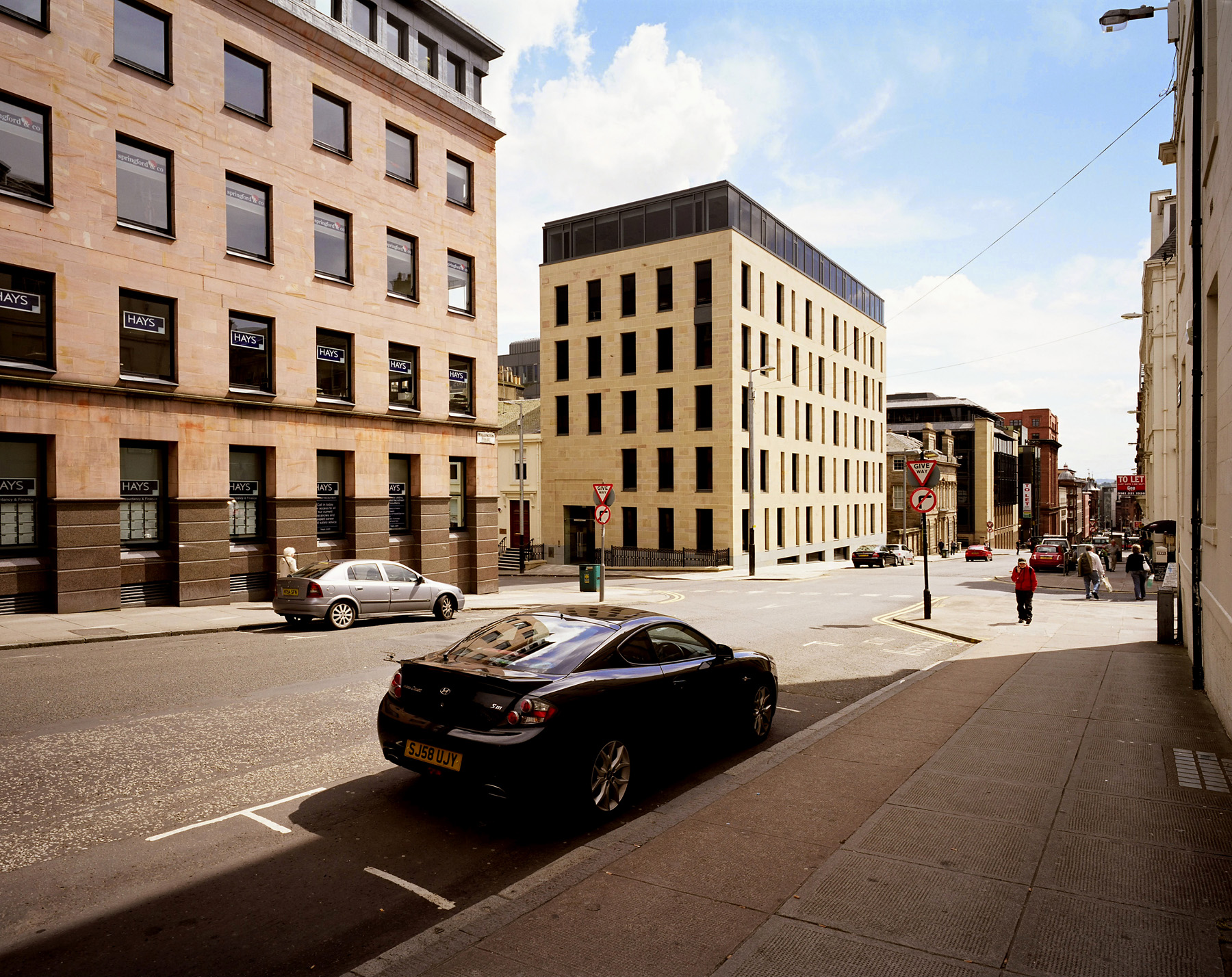The ground floor foyer space is accessed directly without the traditional short flight of steps from West Regent Street. Car parking to the basement is achieved through the use of mechanical stackers, accessed from West Regent Lane.