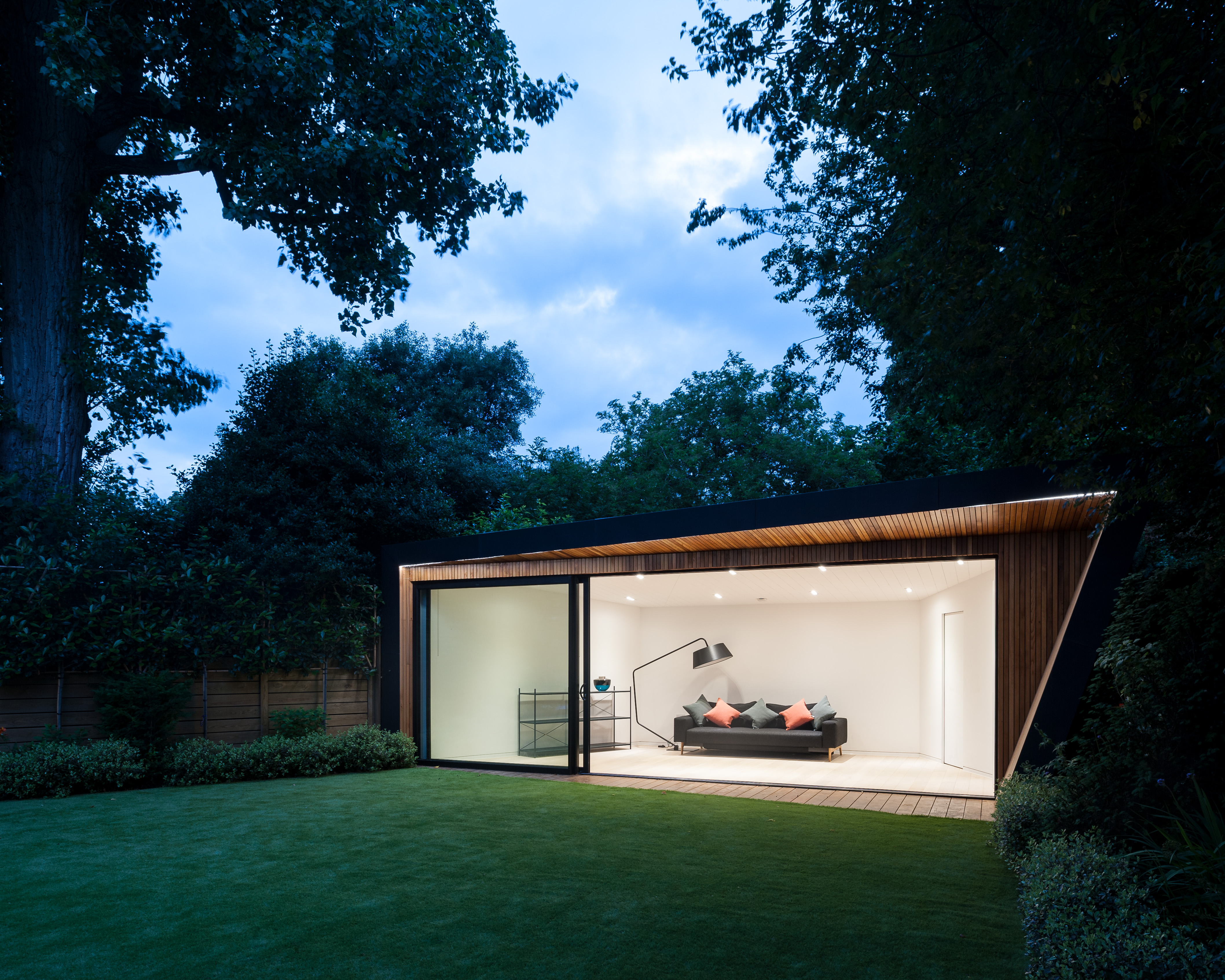 A single storey angular studio space, nestled at the bottom of the private garden provides flexible room for a family to enjoy yoga, play or just a room from which to enjoy the garden and family home beyond.
