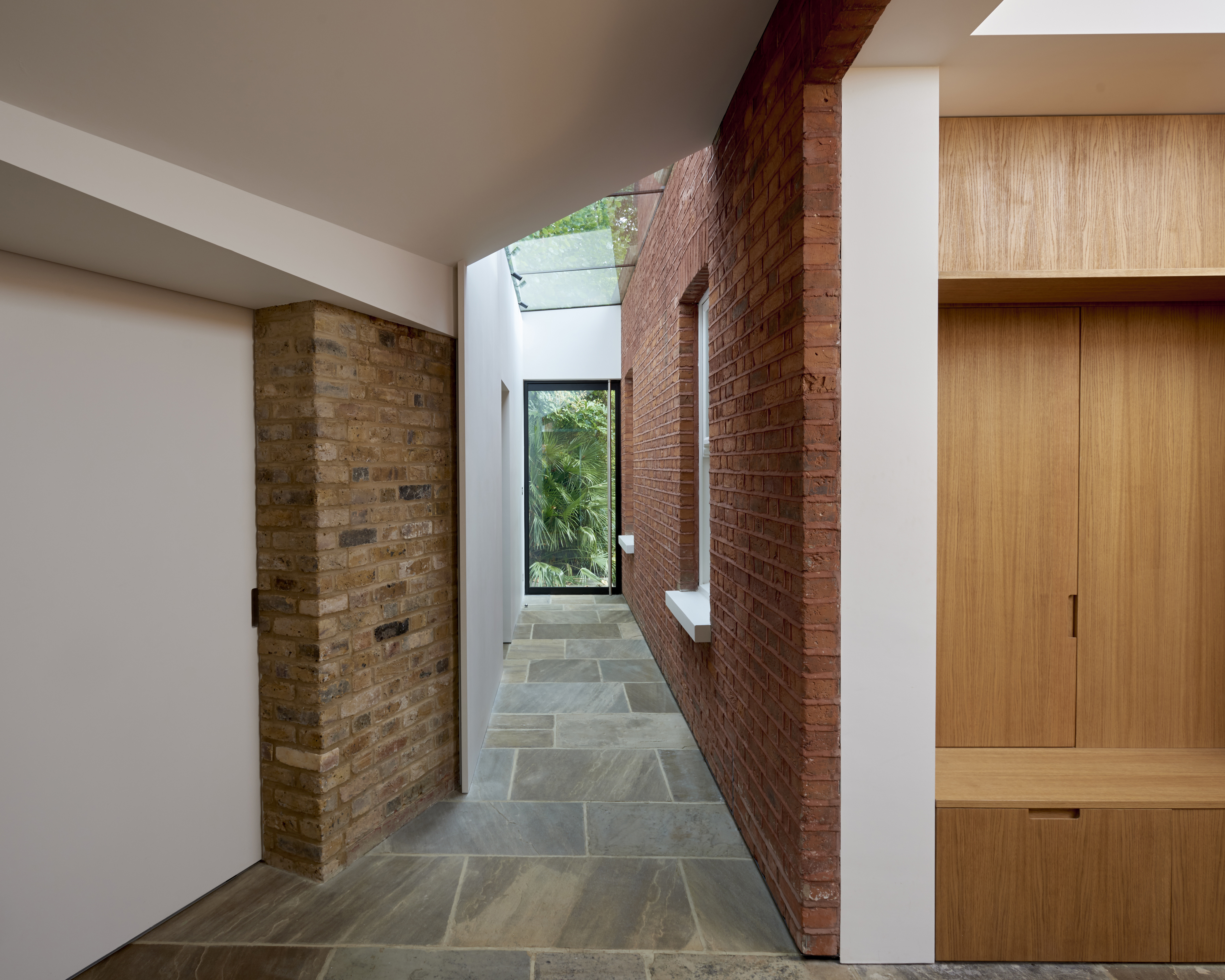 The external brick wall of the house became an internal feature. The new stone floor relates to the outside space. Specially fitted joinery units form a series of pockets with concealed doors to the kitchen, WC and coat cupboards. Just like magic...now you see them, now you don’t.