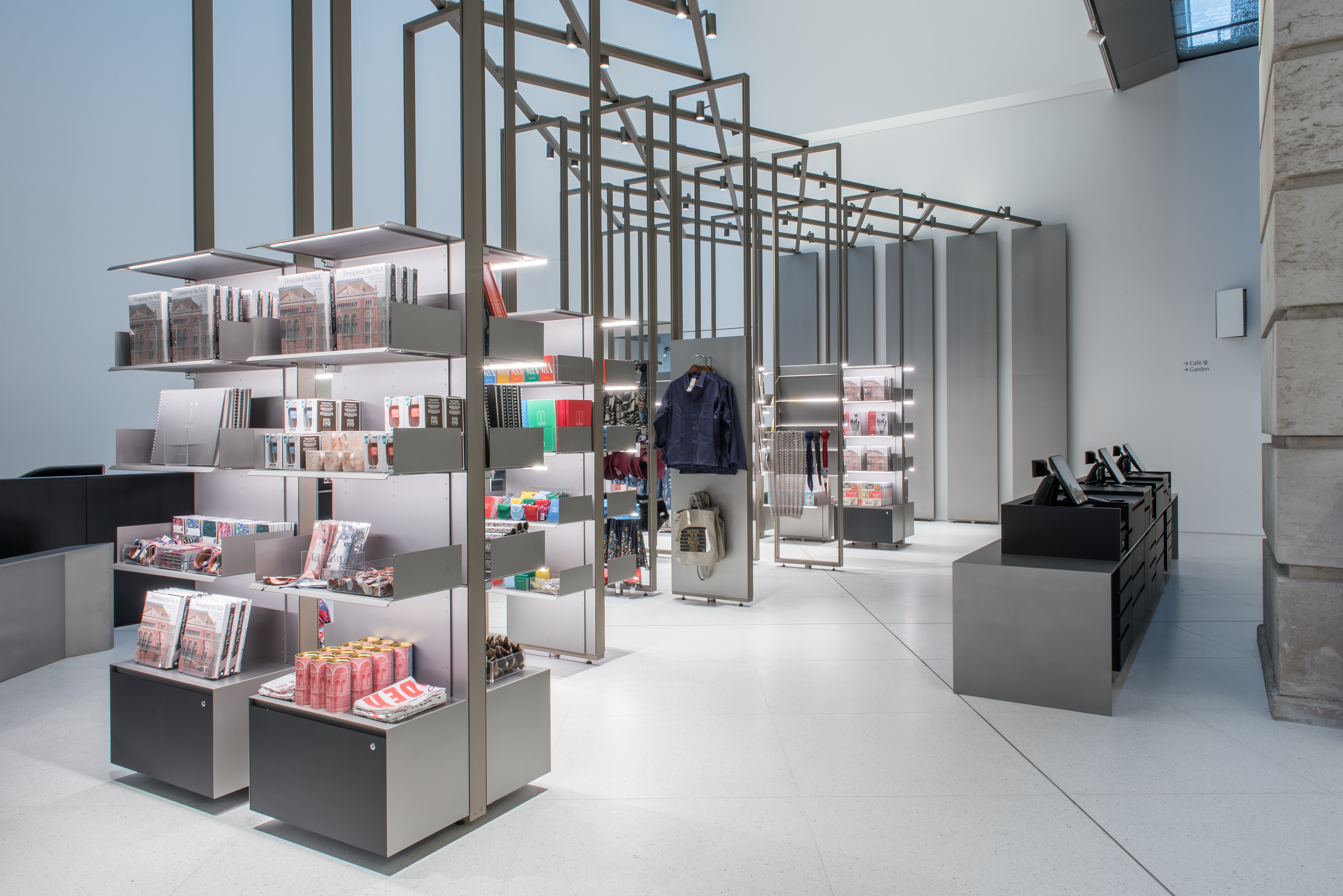 The competition-winning solution developed by Mark Pinney Associates creates a series of 4.5m high, demountable pivoting frames with slender, bespoke extruded sections developed with Vitra. The open frames are retained at their head by a diamond grid steel lattice structure which is tied back to a service wall at one end and supported at the other by a fixed sign panel. Each frame can be fitted with a combination of shelves, hang rails, storage bunkers and showcases to display a wide variety of merchandise specifically related to the current exhibition. The upper levels of these frames provide an opportunity for high level display, and establish visibility for visitors from the entrance courtyard. The frames can be pivoted and or removed to allow differing circulation routes around displays and through the space. Perimeter units combining cash wraps and display cases for small products provide much needed back stock storage.