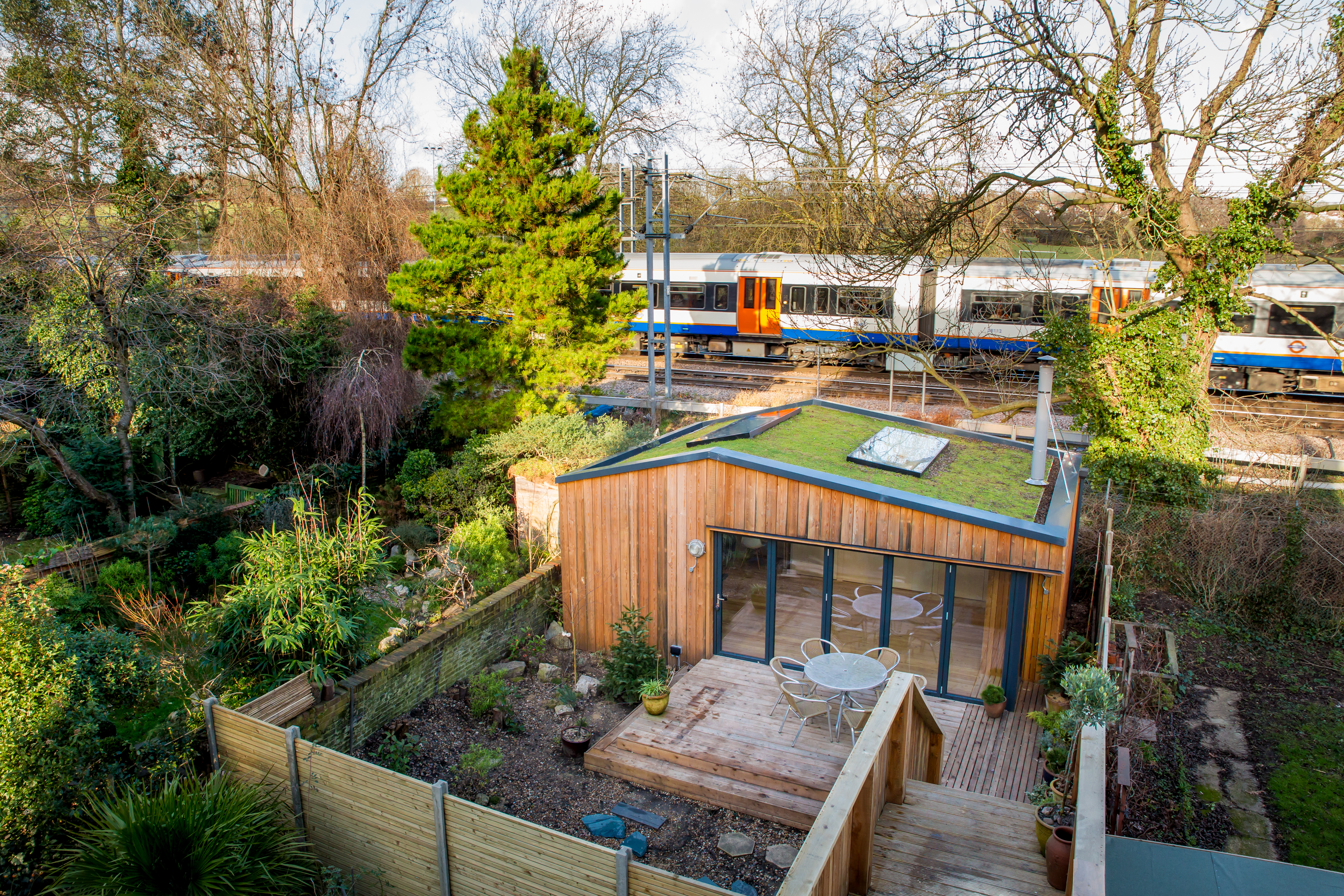 MAP architecture have worked with the clients to meet their aspirations for a flexible space, with lots of storage, that has a rustic Scandinavian feel. Green Douglas fir beams, a sedum roof and rough-sawn larch cladding, compliment whitewashed plywood storage cupboards and contemporary detailing. The bi-folding doors fold into a recess opening the space to the terrace and blurring the edge to the garden beyond.