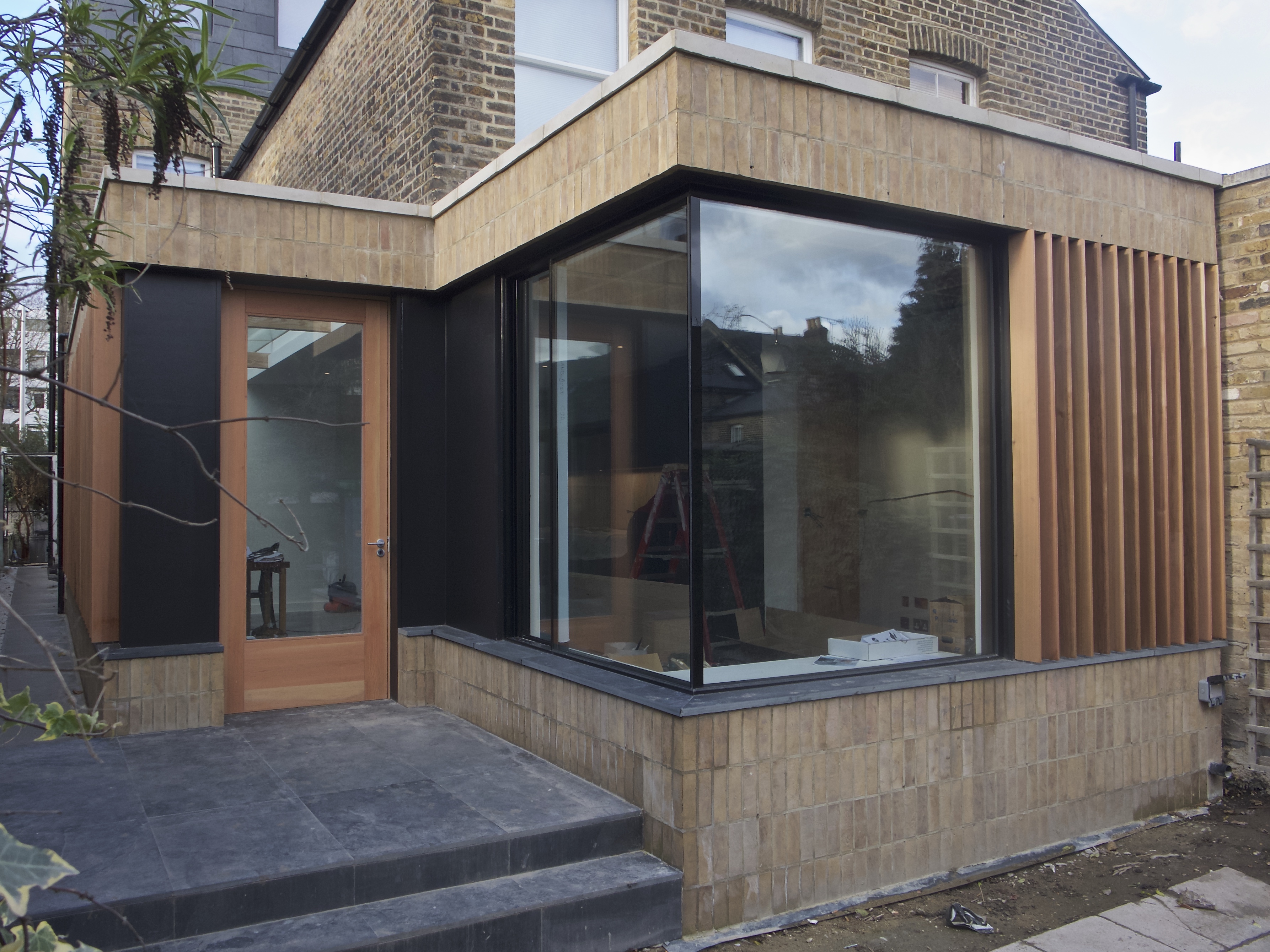 The extensions are two simple volumes built with traditional materials that blend with the existing house but used in a contemporary fashion, for instance yellow brick are used for the plinth and the overhead band but laid in soldier course. A curtain of cedar wood louvres animates the elevations, spaced more or less tightly depending if they sit in front of a window or of an opaque wall.