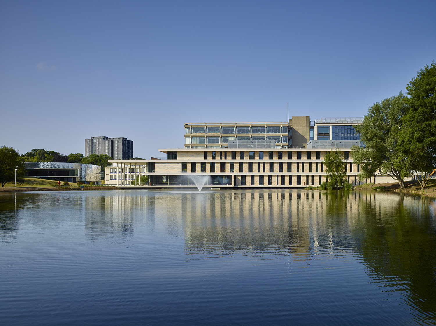 At this university campus, comprising a mixture of Brutalist and Modernist buildings, the brief for the extension to the existing library block required a new building that would function as a student centre with learning, media and support services.