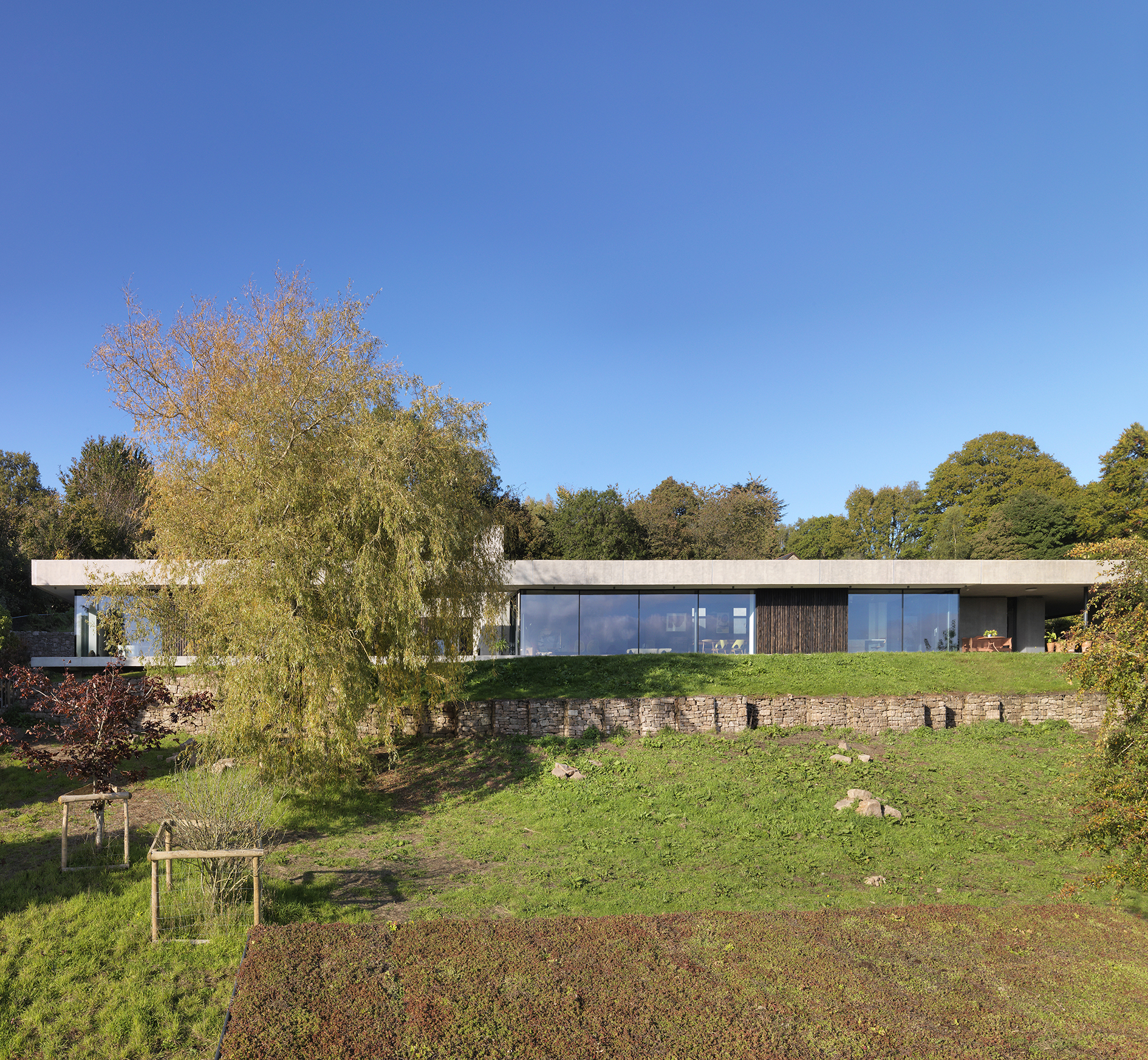 The project has also surpassed all environmental targets set within the clients’ brief, achieving an EPC rating of A Plus following a 96/100 score and an actual annual building emissions rate of 3.44kg/m². The building achieves its credentials through a combination of a highly insulated fabric, including elements below 0.1W/m²K; an inverted green roof seeded from the adjacent field, with huge thermal mass potential; triple glazing; and technological systems such as photovoltaic solar panels, solar thermal panels, a ground source heat pump and MVHR. In addition a low-energy LED lighting scheme has been specified throughout.