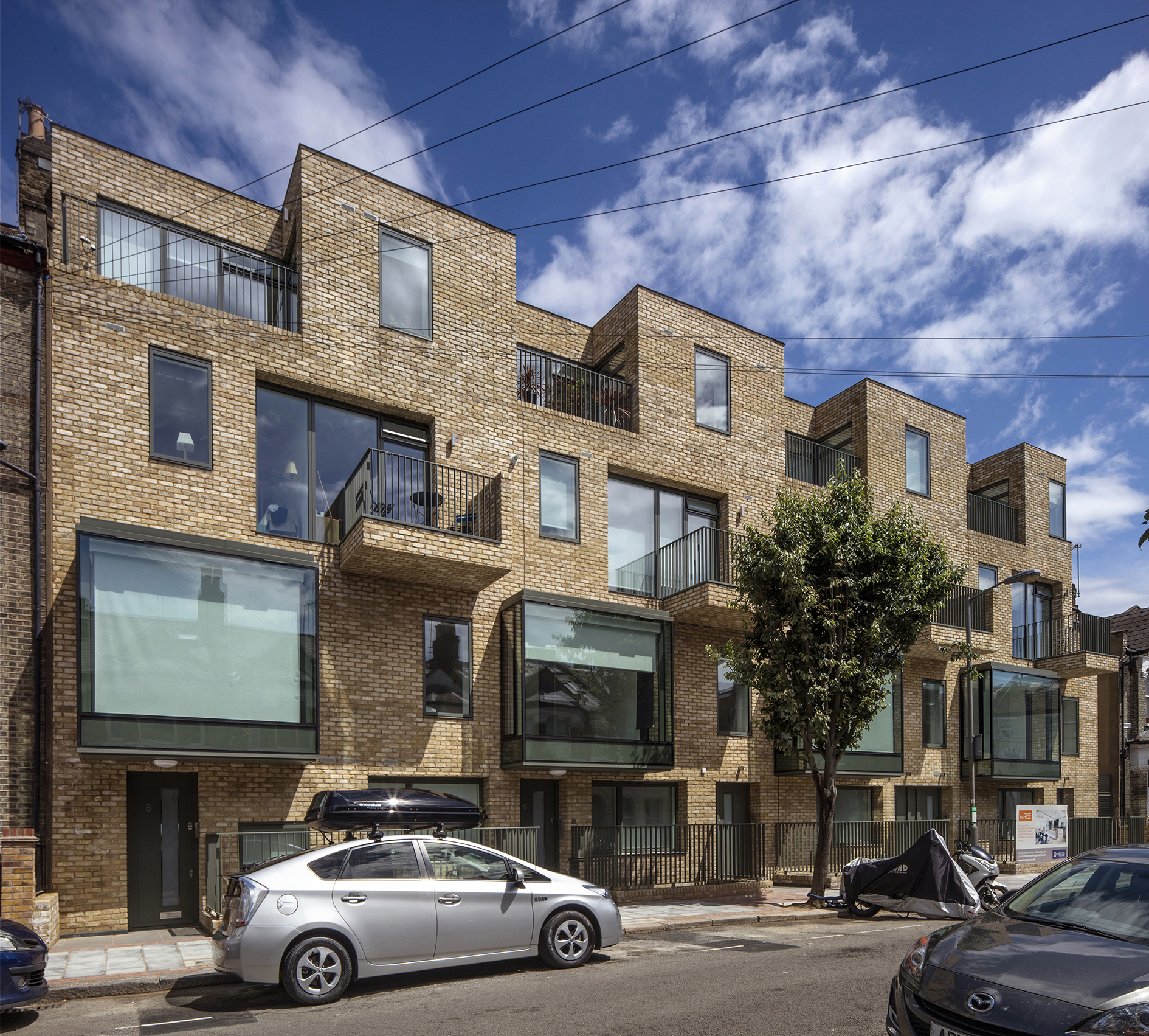 On the front elevation, windows are many and varied – big rectangular oriels pop out at first floor level, echoing the bays of the street’s older houses, and solid brick-clad balconies protrude from the facade.