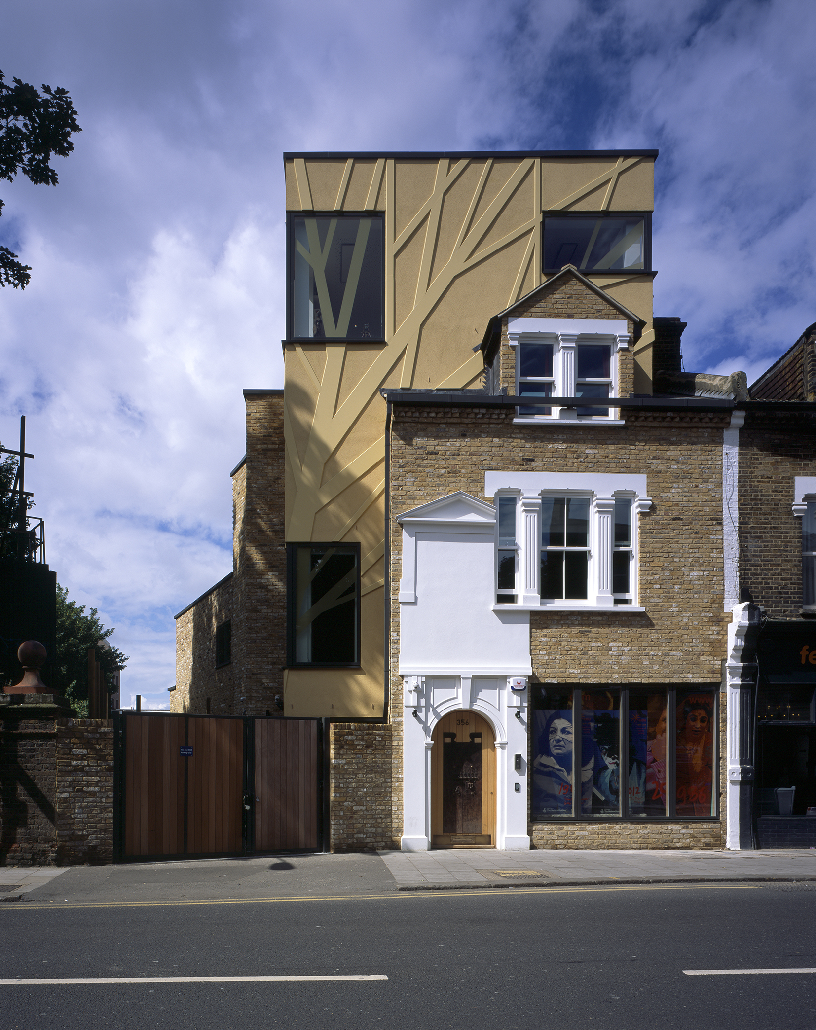 Conceptually, the building is a banyan tree growing up through a 19th-century commercial terrace; a tree in whose shade performances were traditionally carried out on the bare earth. Thus the stage is 50m2 of Jurassic Coast cob while a branching motif covers the exterior in window transfers and Sto render.