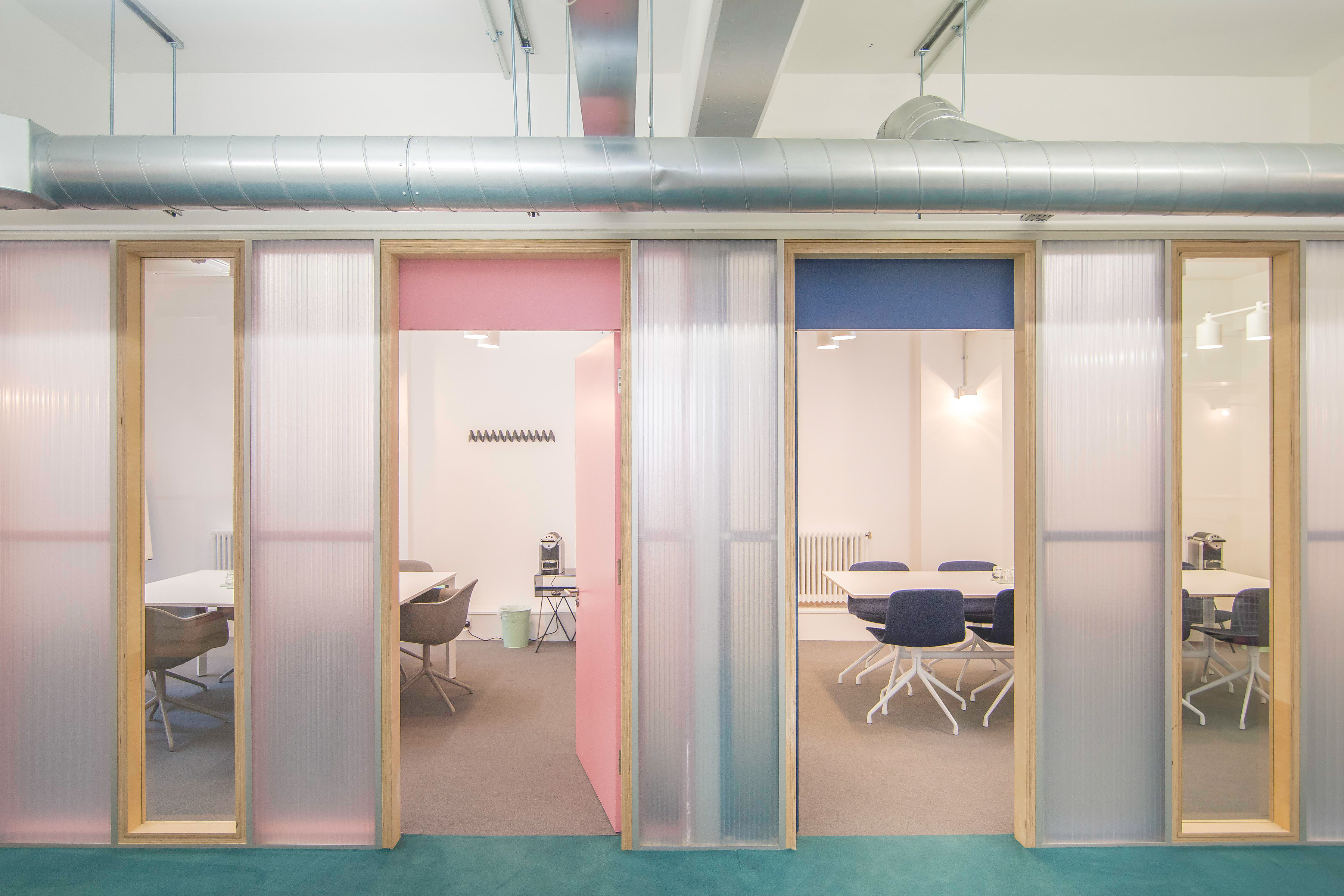 On some floors, cellular offices have been inserted to provide smaller spaces for start-ups and new companies. The walls of these use the same timber-framed screen system that also divides the larger co-working spaces to create smaller meeting rooms. Designed by the architect rather than using an off-the-shelf system, these walls are meticulously detailed and fit well into the space. Their mix of clear and semi-transparent polycarbonate glazing provides a sense of openness and a visual connection between office spaces.