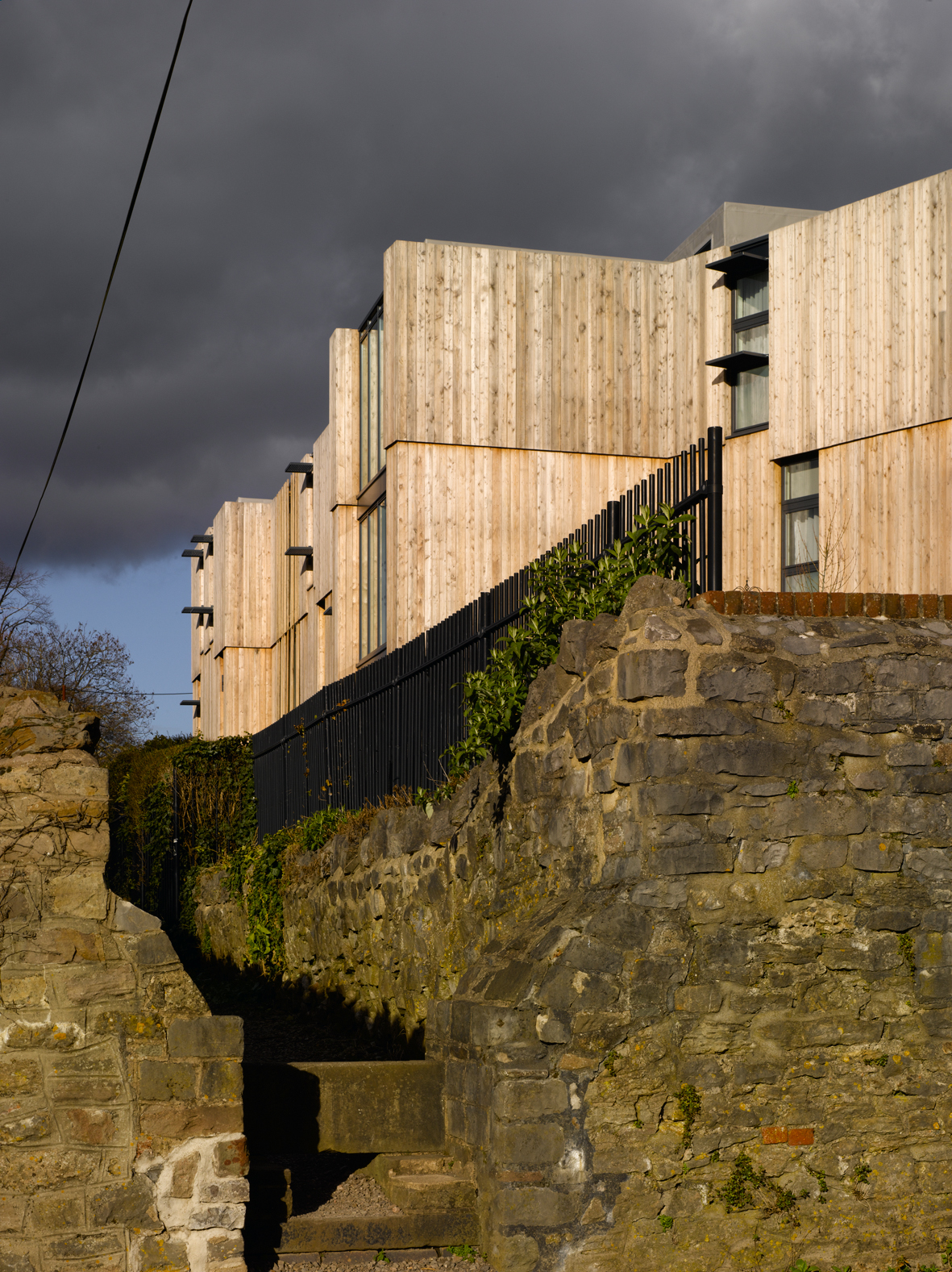 The conservative nature of the surrounding architecture lead to the pragmatic form of a three-storey rectilinear building. A permanence, requested by the client, was given to the building with a larch cladding, which has a 75 year life expectancy. Sustainable measures were taken to provide natural ventilation and lighting.