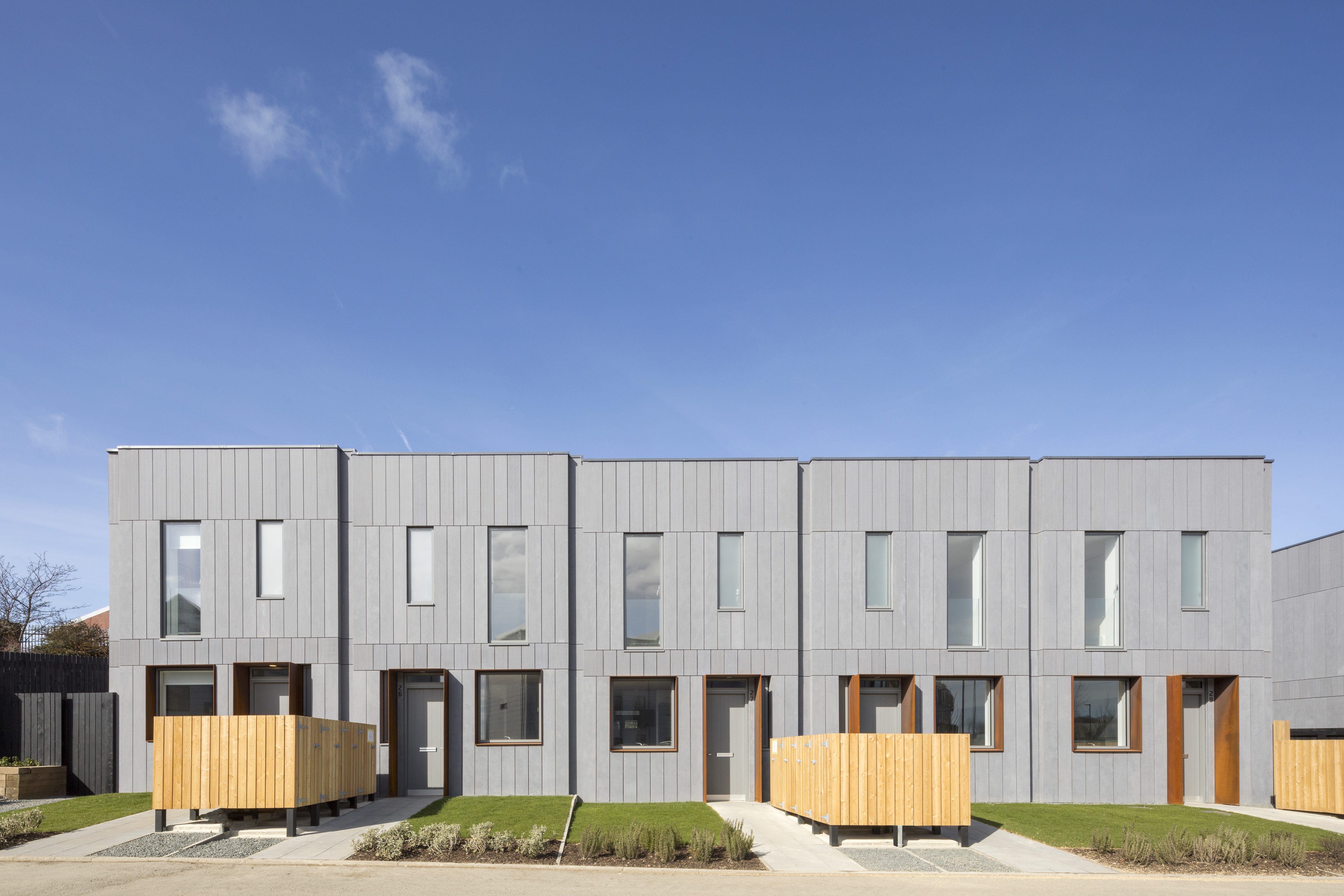 The starting point of the design was working on general principles of simple forms and exposed materials. Ten two-storey houses, faced in a grey Equitone cladding, play to an unashamedly Modernist aesthetic. While the choice of Equitone as cladding was not a given for the Fab House, it’s one of several key design choices that, having been tested successfully on the House units, were adopted here – in this case allowing services to be accessible behind a single removable panel. The cladding is detailed, with vertical panels staggered and punctuated by a narrower, textured strip between storeys, and a deeper, cornice-like one at the top. Each house is further delineated by a stepped-back panel between them. In all, this has the effect of proportionally balancing and grounding the façades, compared with those of the House units, where the grid of silver-grey panels suggests a metallic skin.