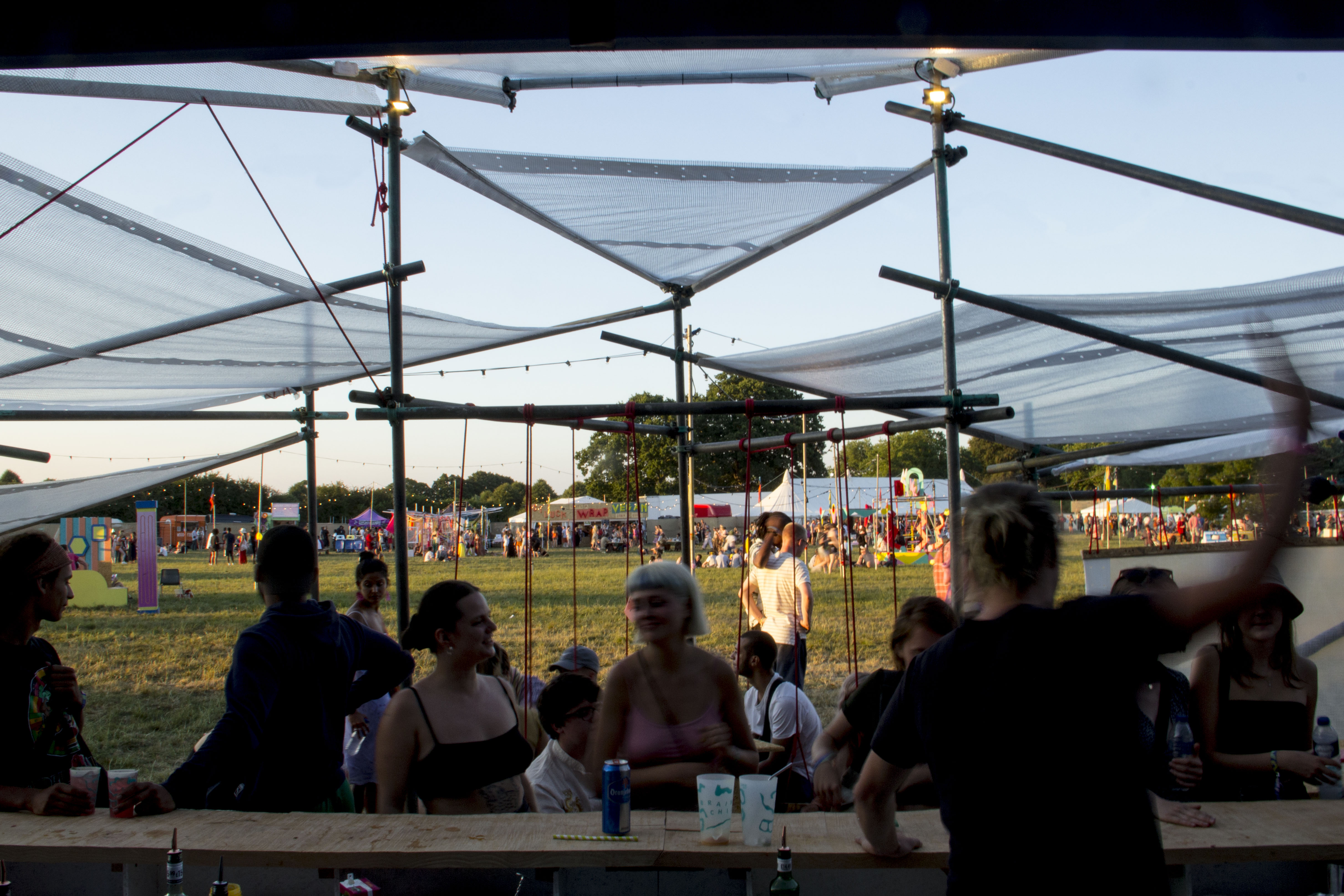 The bar uses a scaffolding frame arranged on a 2m triangular grid. The frame supports the various elements of the bar, creating a series of semi-enclosed spaces not often found at a festival.