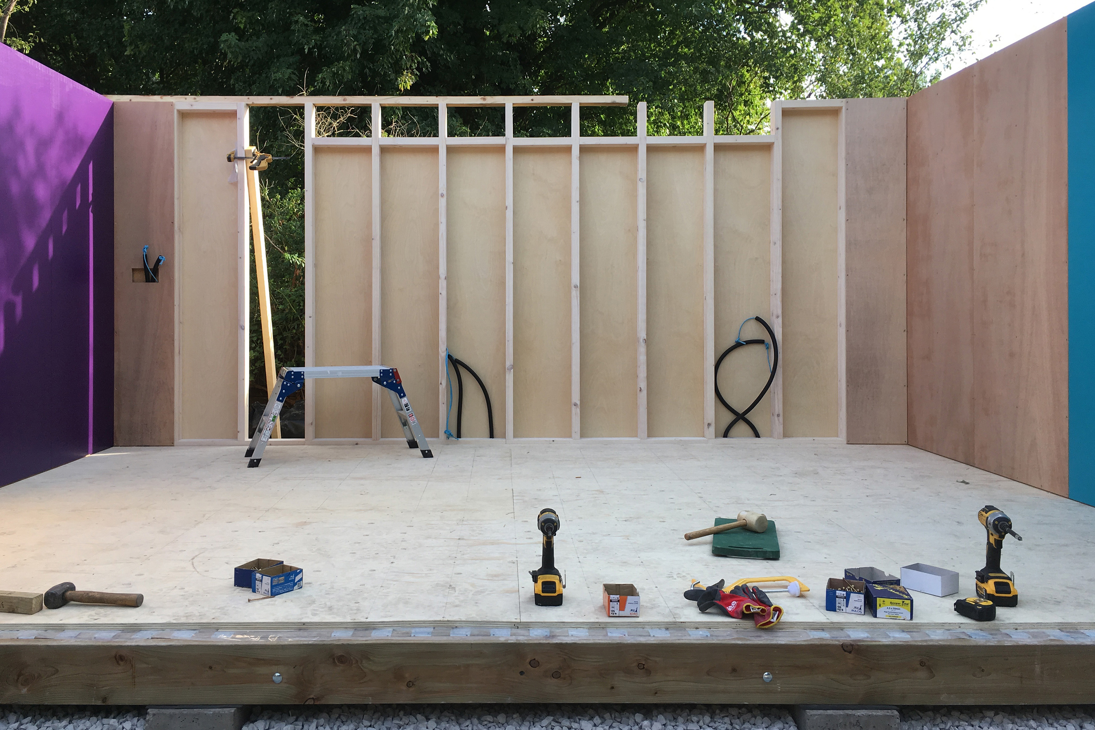 The wood fibre insulated timber frame and birch plywood lined interior adds a warm but useful depth for bespoke joinery such as full-height shelving, bulletin pinboard and pegboard to display sewing equipment as beautiful artefacts. The rear wall with clerestory window offers high-level views to mature trees, the setting sun and incorporates a secret door leading to a garden hide away: ideal for small people and pets.
