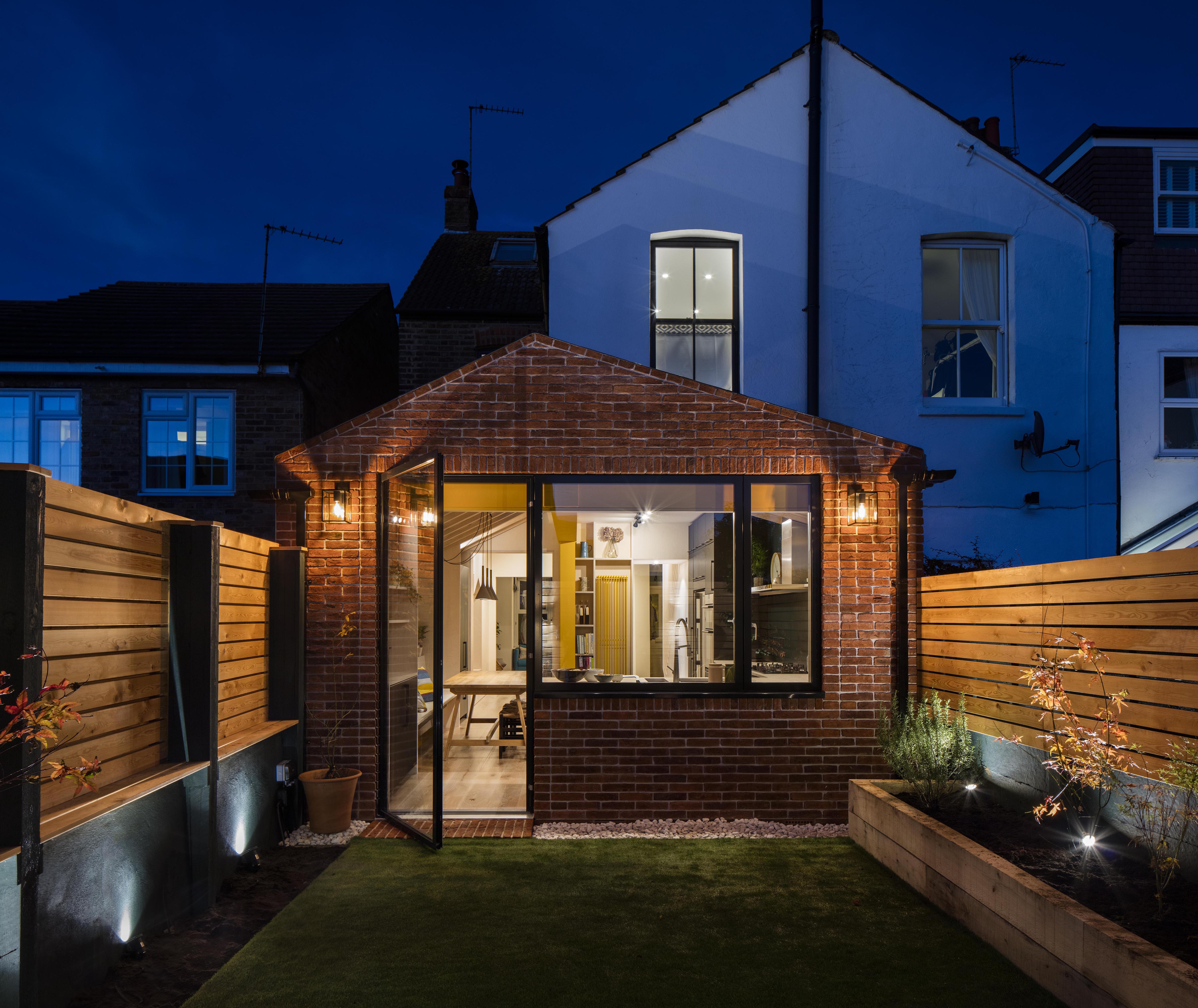 Large rear glazing with uniform sightlines between timber frames and aluminium sashes allow natural light to flood in from the garden which, sitting perpendicular to the adjacent terrace, provides an outlook over a vast expanse of sky.