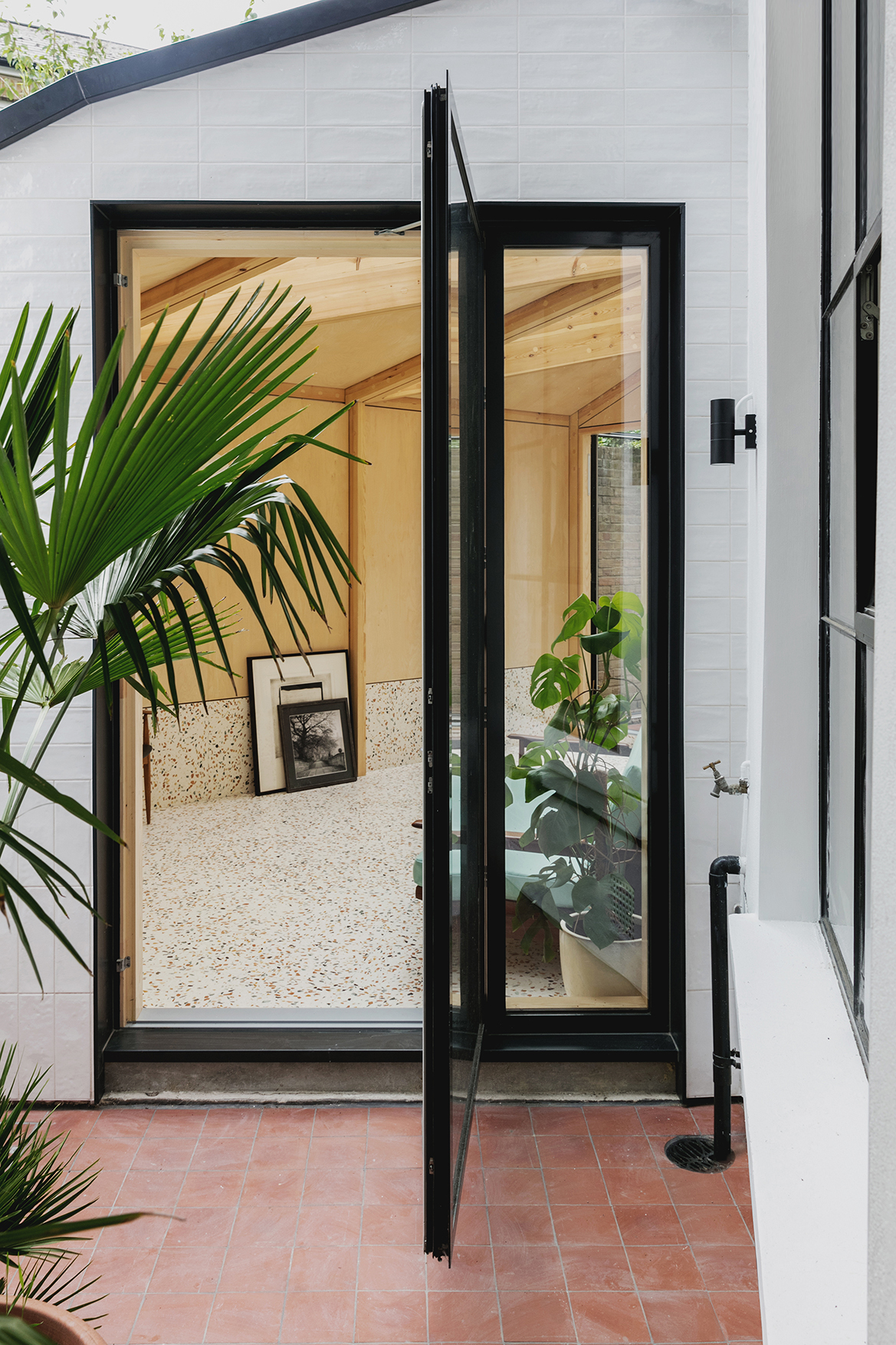The structure is formed by seven exposed structural timber posts that support a beautiful triangulated roof formed from bespoke metal flitch plates and deep timber beams. Large triangular rooflights bring north light into the space, transforming a dark and unused courtyard, celebrating connection to garden and sky, and retaining the sun-filled south-facing garden.