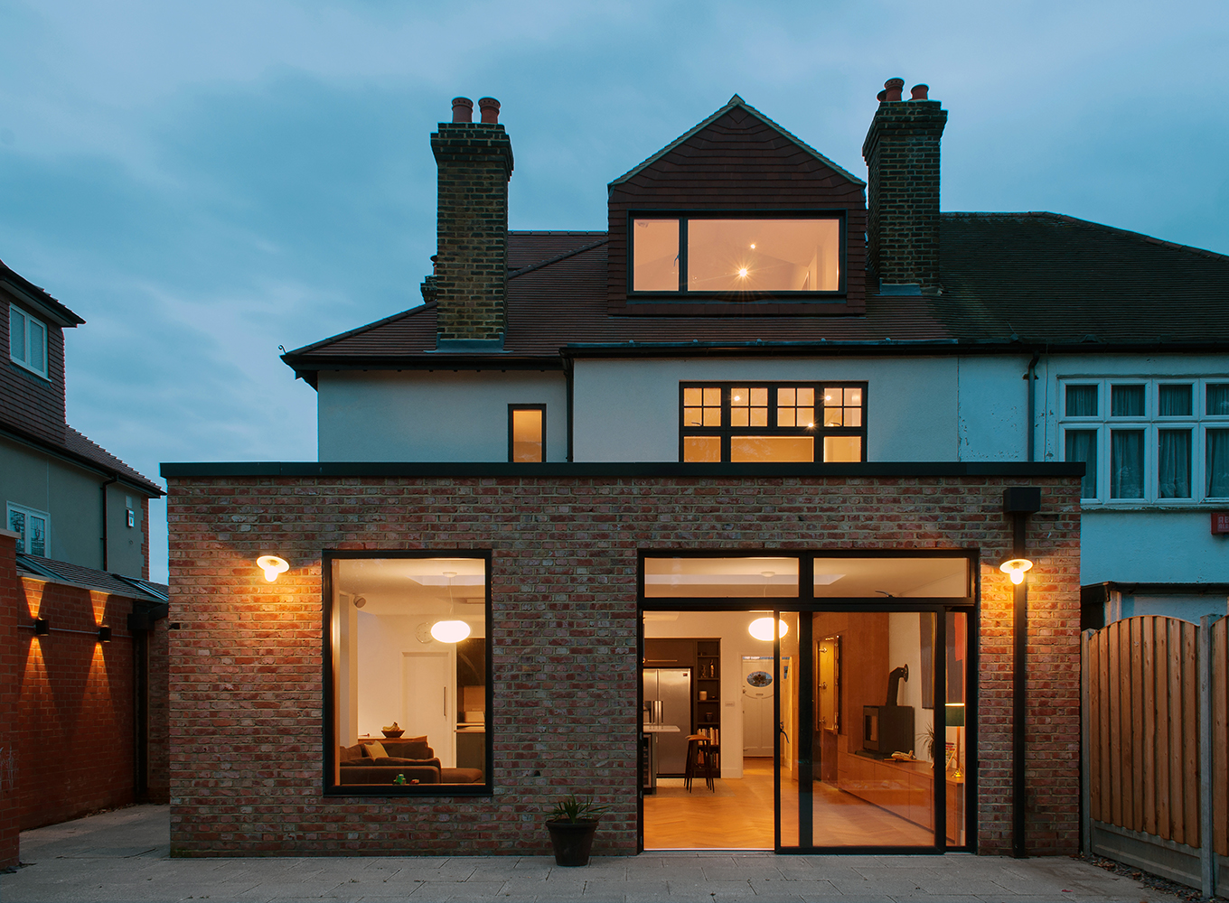 The rear extension is formed of bricks reclaimed from the original rear walls of the house, with a Flemish brick bond employed to make full use of all broken half bricks.