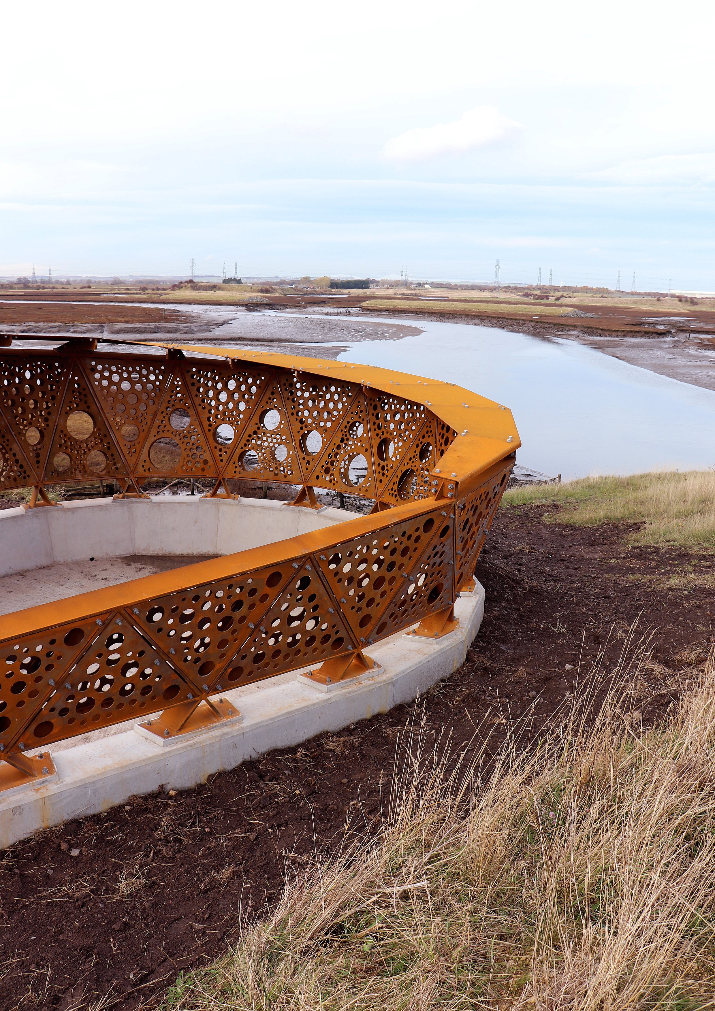 The seal and bird hides are both Cor-Ten steel fabrications, overlooking the estuary and newly created salt marsh. The ornate faceted façade and associated framing were defined using a parametric model. The hide is partially submerged, reducing the apparent size. A panoramic slot elevates the facade, appearing to hover above the bank, allowing views out from just over grass level. A crescent moon roof offers protection over the observation points, while maintaining the framing of the sky.