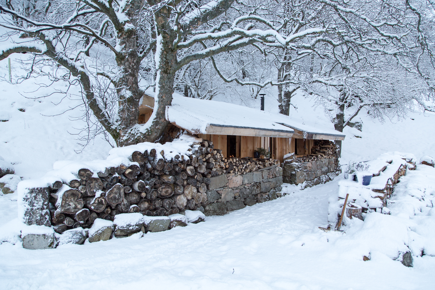 A Douglas fir structural frame that was selected, felled, milled and jointed by hand before being erected while still ‘green’ supports a gently curved planted roof that oversails the partially reconstructed drystone walls of the old croft.
