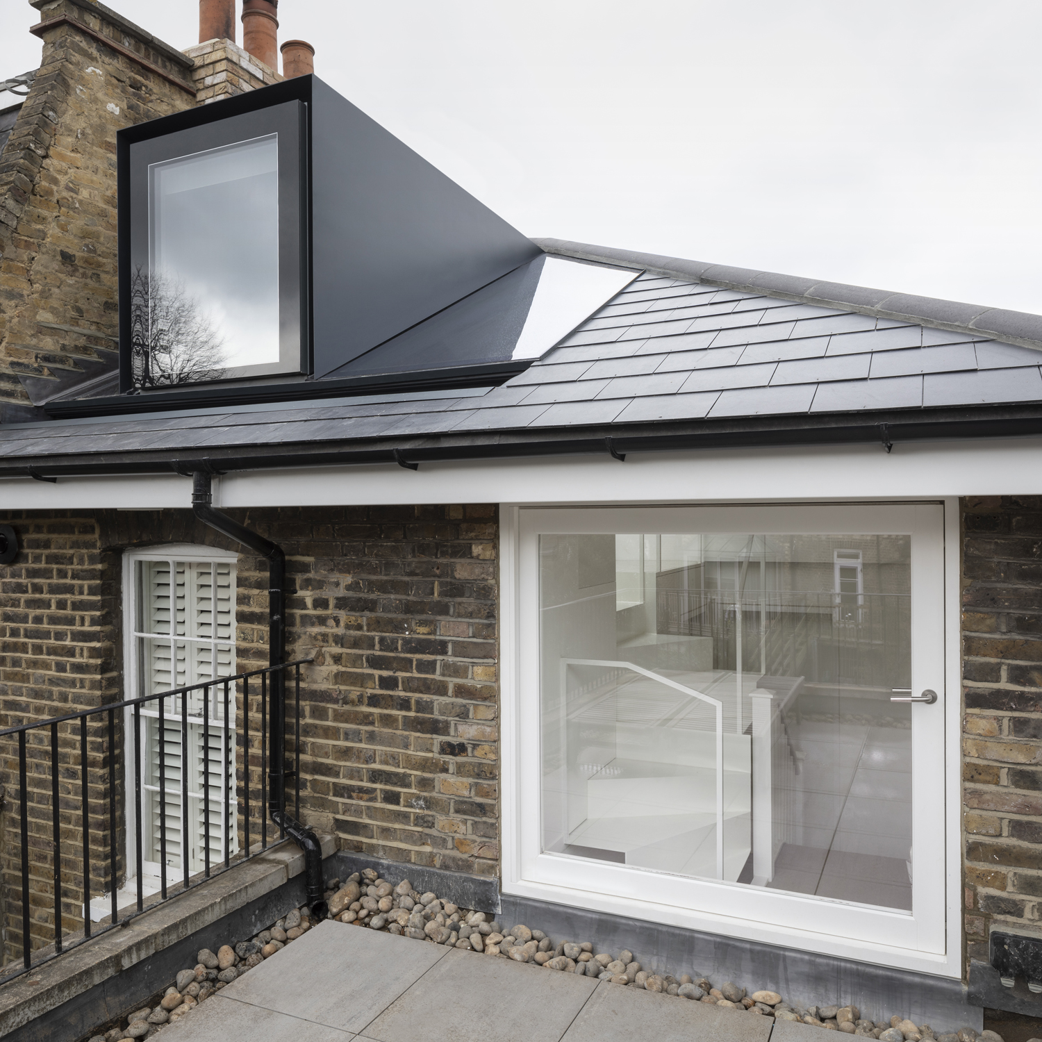 The concept for the scheme centred around maximising the potential for this tight space within this contentious context. A large opening to the rear was created to maximise light into to space, allowing for greater head height and facilitating an intriguing, tactile relationship to develop with the existing prominent brick chimney and parapet; typically confined to the otherwise distant world of roofscapes. A contemporary anthracite steel element is then placed within this opening, spanning across the void.