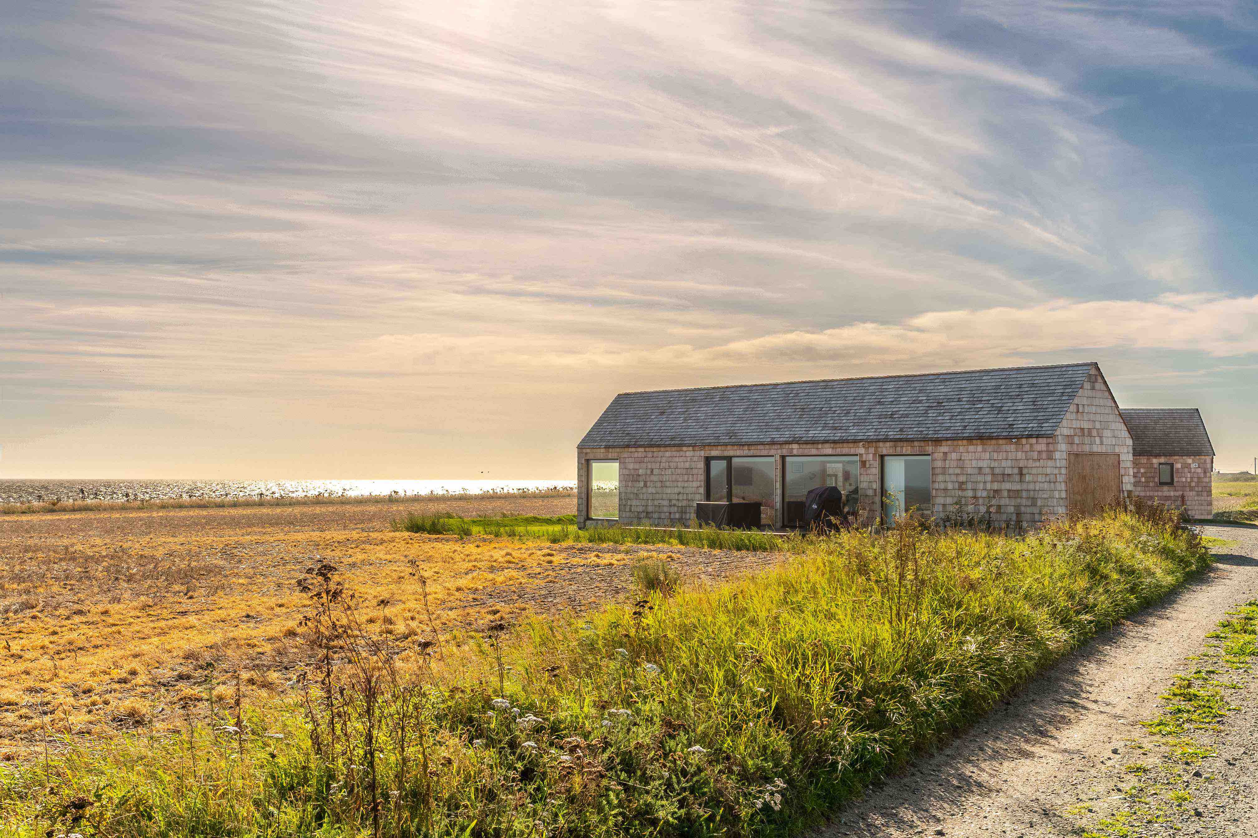 The natural wood weathers to a silver grey seen in sky and sea of this location. The buildings have large windows to this windswept landscape so as to place the occupier right within this coastal area of outstanding natural beauty. The design is very low maintenance. No gutters or downpipes, no decorating externally, no mortar or cement to crack.