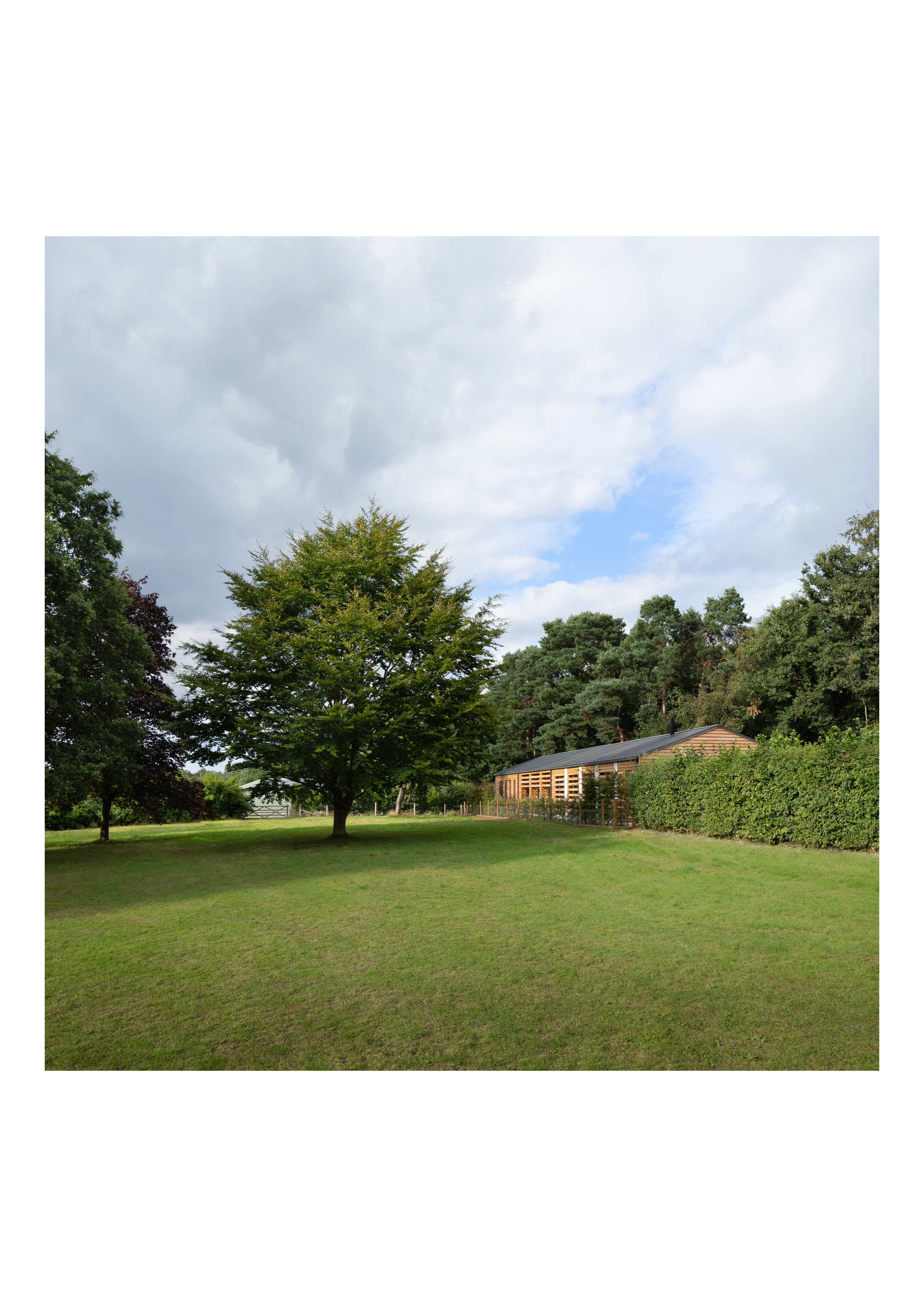 For the new roof structure, we opted for a scissor truss to maximise the ceiling height at the centre of the space. Constructed from a combination of glulam and steel ties, eleven trusses are all subtly different, introducing a structural rhythm along the length of the space. This is achieved by varying the angle of the steel tie at each structural bay, not unlike the ticking hands of a clock. The brief called for both privacy and openness from the adjacent field. This was achieved through slatted screens and deep reveals. These strategies also served to reduce solar gain, which was a consideration for this west-facing site.