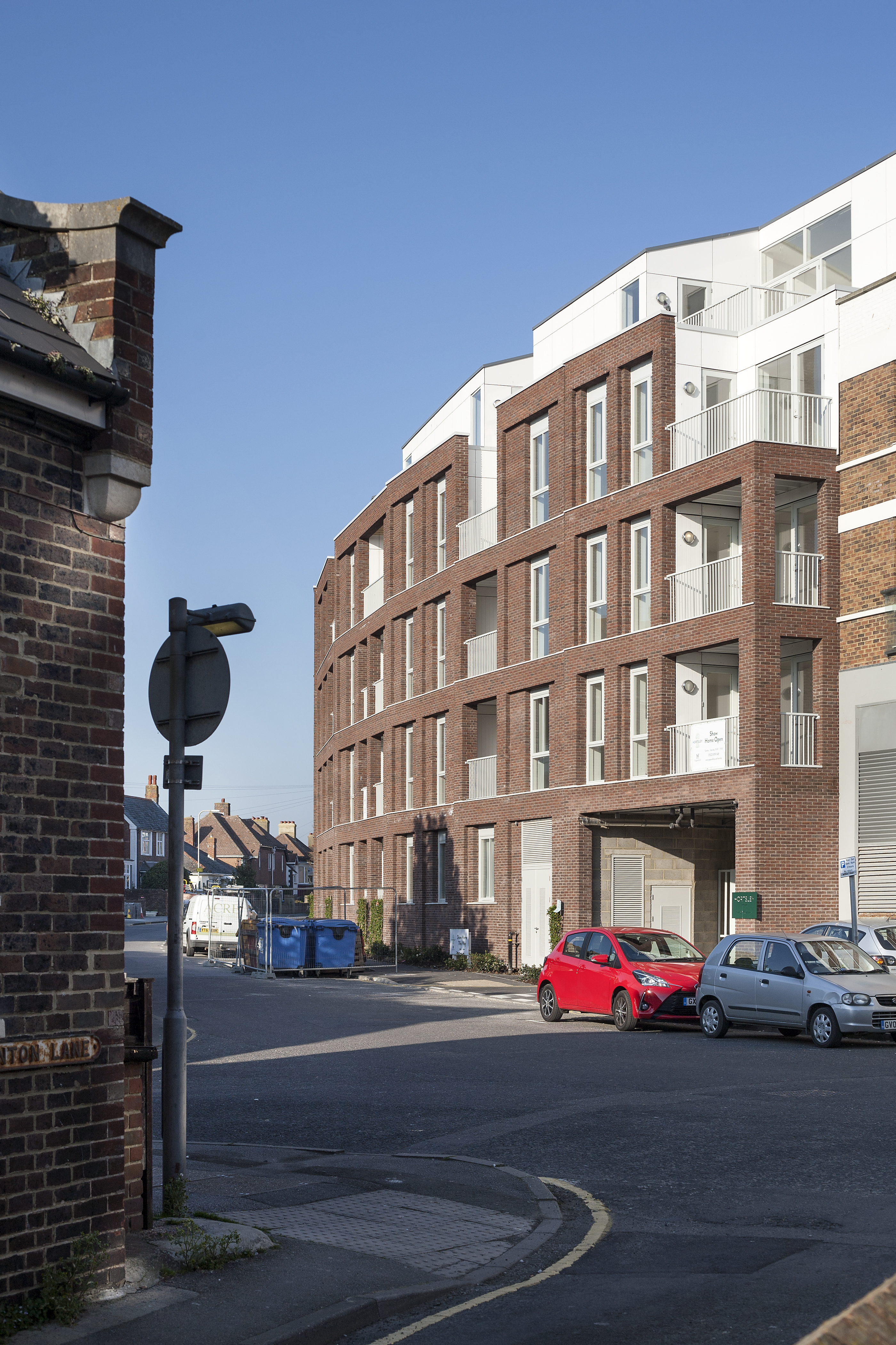The main part of the site faces a side street in the centre of Seaford. This frontage is treated in brick, with a rhythm loosely recalling the Regency seafronts of so many south of England seaside towns. However, the building is oriented towards the much smaller frontage along the bustling Sutton Park Road. This connects the building to the life of the town while also allowing for a series of carefully considered transitions from the public space of the street to the privacy of the flats.