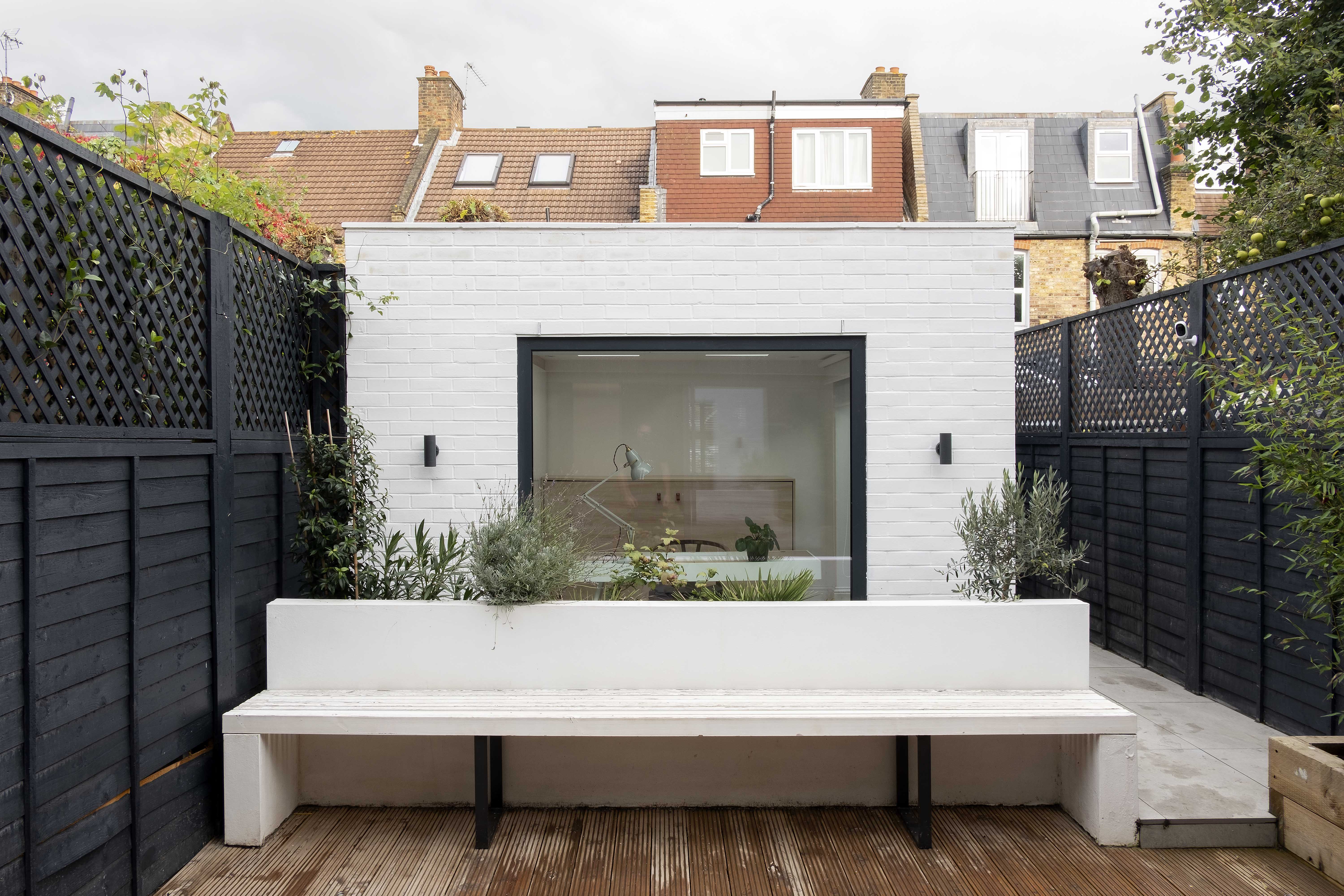LUD Studios has added an extension clad in black metal cladding and a white garden shed to a terrace house near Wimbledon Chase Station