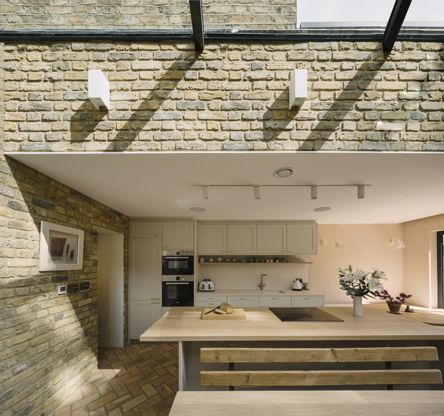 Mindful of the existing character of the house, the original ground floor rear window openings, with its curved brick arch, made a natural doorway between the kitchen and reception-living room. The Yellow London Brick façade of the original house was retained and left exposed within the extension to show the threshold between the original and new extension.