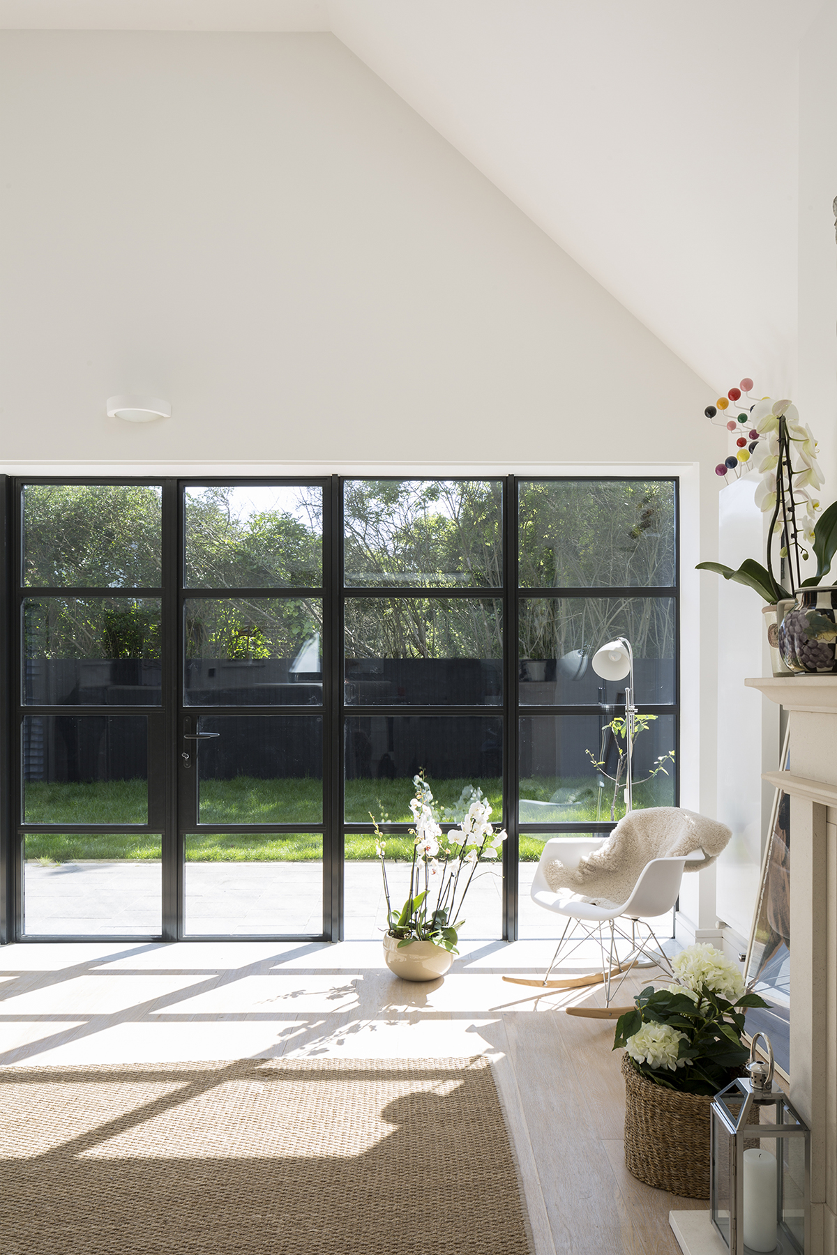 We used low cost timber floor boards that were then painted white to give a better finish than the original budget would allow. Moving to the main living room, the client made clear that existing building had a broken connection from the internal living space to the large garden that sits around the site. A collaboration of ideas tested using different materials and finishes, and through 3d modelling/CGIs, we came to the final design which used a full width Crittall curtain wall placed along the rear wall.