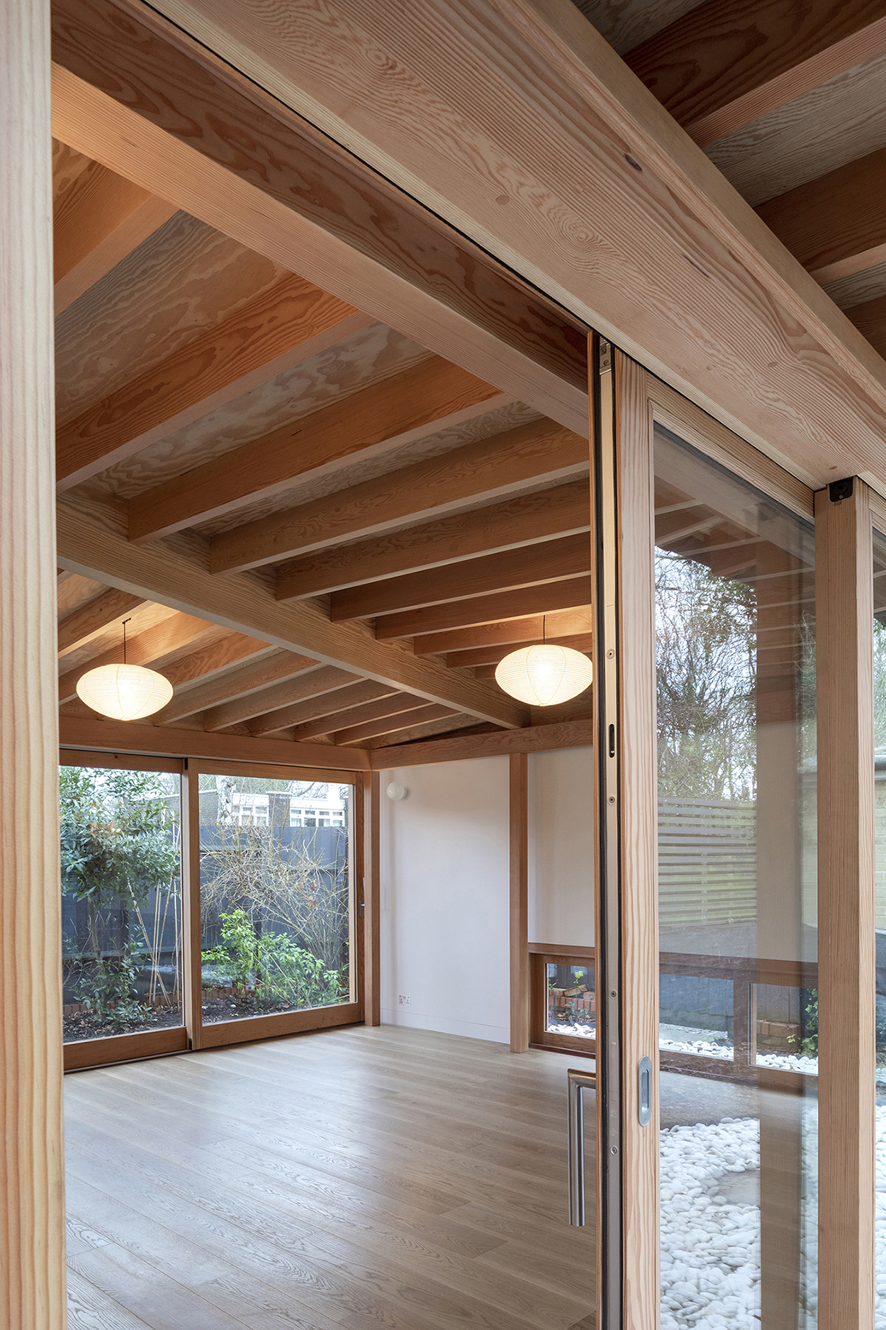 The aim was to give the house a new more generous well-lit living space, accessed off the kitchen, improving the house’s connection to its garden. The new extension is also used occasionally as a yoga studio. The site is in a conservation area. From a planning perspective, the aim was to keep the extension low to the existing fence and discrete from the street.