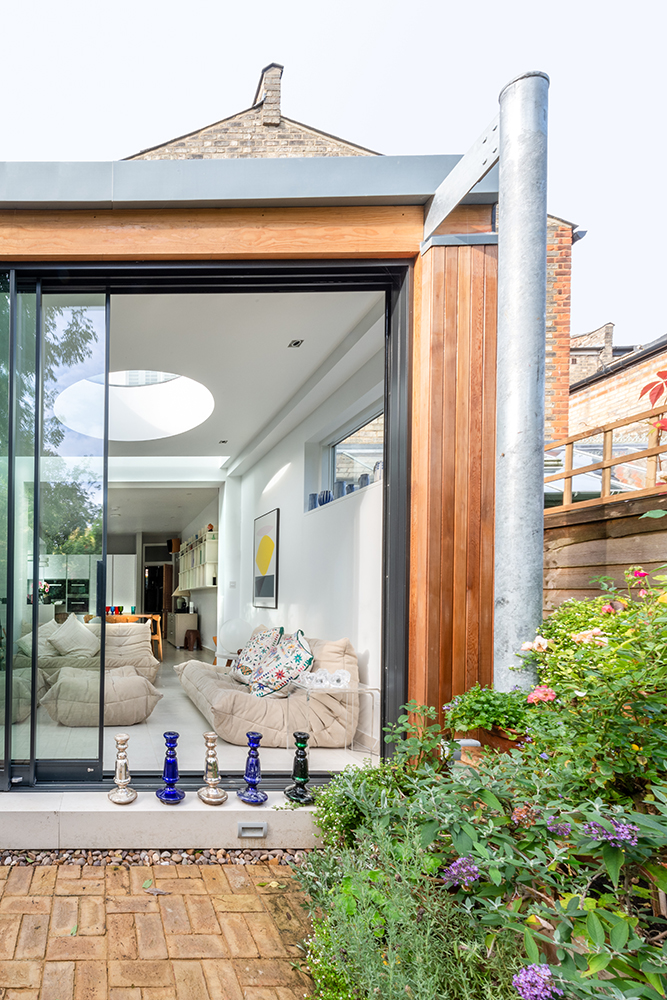 This way we saved the existing floor and created the effect of a floating roof. This effect is supported by the band of glass between the existing house and extension roof. The roof itself features a circular roof light, adding a sculptural quality and together with external columns, gives the project a timeless mid-century modern look.