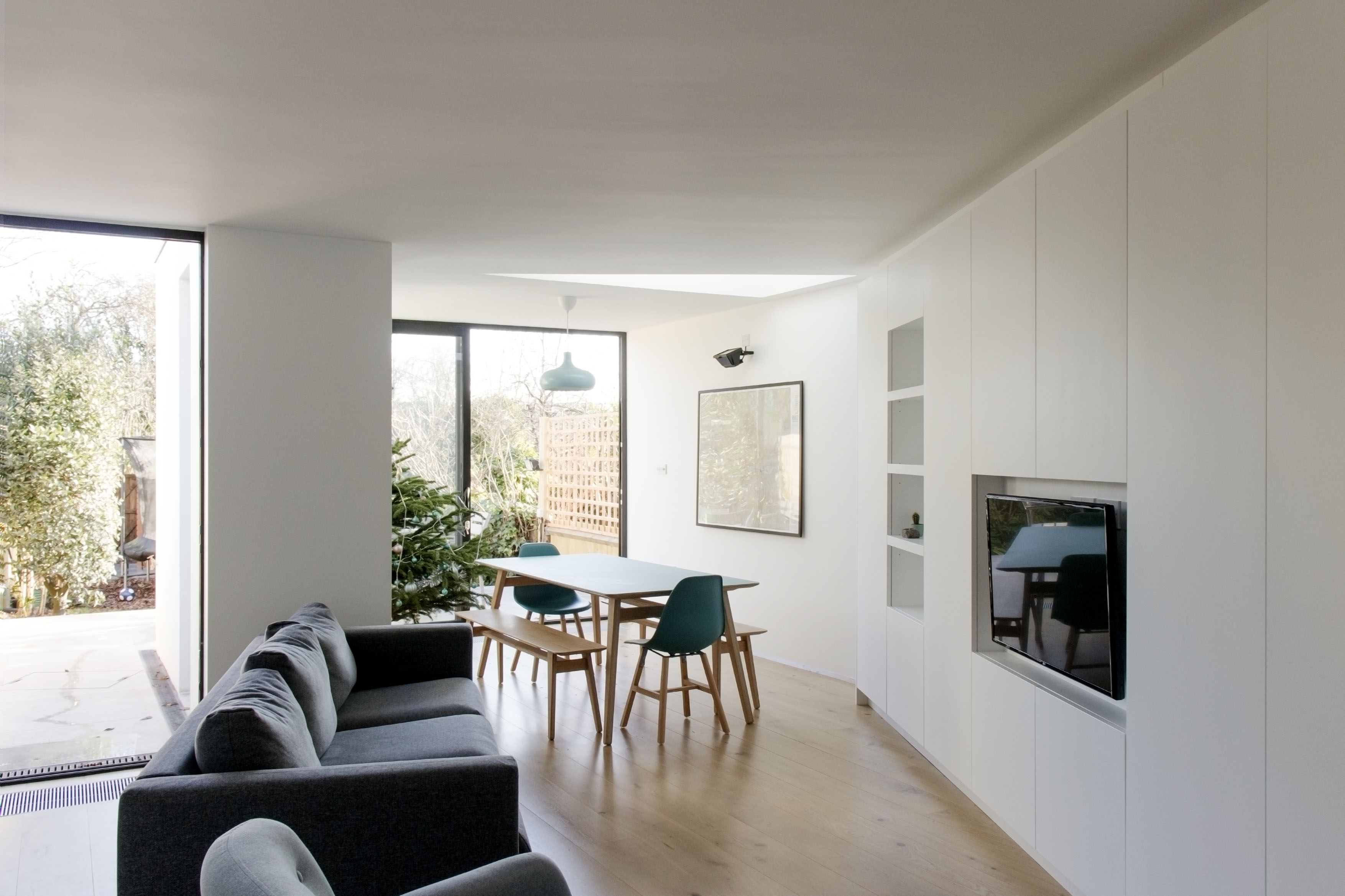 While also rectilinear, the new external form is oriented to the garden rather than the house, resulting in triangular gaps where it meets the original building. These gaps are glazed, and appear from the exterior as voids between the misaligned rectilinear buildings—while from the interior they are perceived as triangular roof-lights due to the continuity of the ceiling planes between new and old.
