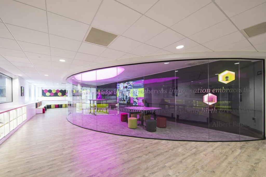 Furthermore, the curved glazed wall which surrounds the space can be drawn on making it a feature for the space, but also interactive for the students. Together this creates an immersive sensory environment for children to learn in, which has helped to make it the most successful element of the wider science block refurbishment. The new iCreate space has become an educational hub at the heart of the state-of-the-art science department.