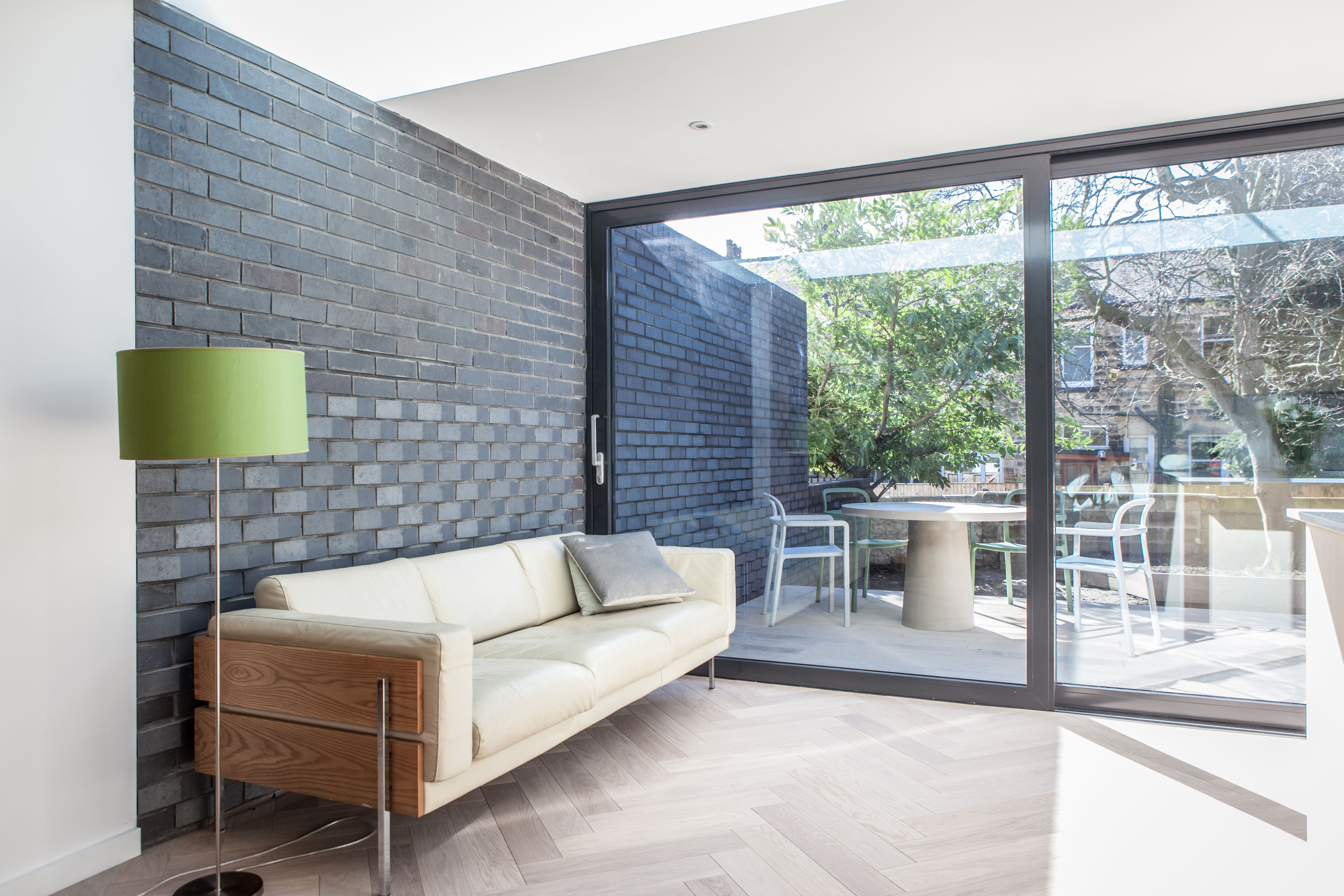 The form is incredibly simple, a 2.5m wide box that extends the accommodation just enough without compromising the garden space. A single roof light spans the length of the main space bringing light deep into the plan. Interest comes in the material choice for the extension. The use of grey brick is intended to offer direct and obvious contrast to the original aged and blackened stone of the main house. Traditionally, brick was a cheaper construction material and in Victorian times was used in areas of a house that may have remained unseen, or for those areas that were not deemed to be of great importance.