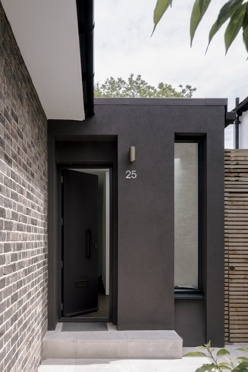 The side extension is monolithic, with hollowed-out apertures and finished in dark painted render to harmonise with the somber bricks and accommodates ancillary functions.